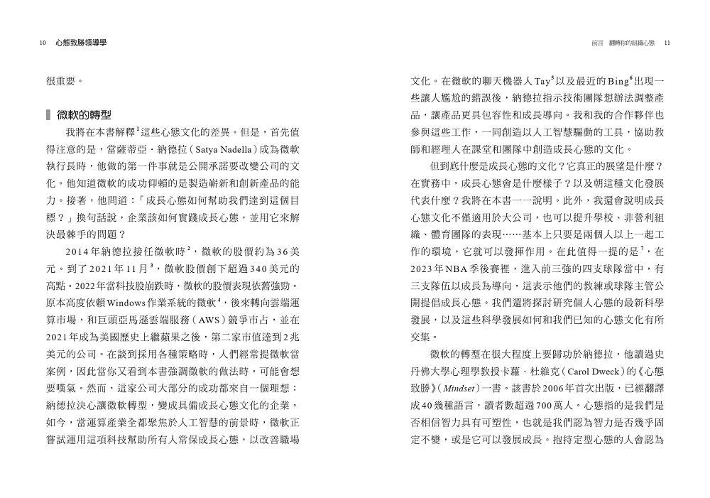 2014年納德拉接任微軟時,微軟的股價約為36美元。到了2021年11月,微軟股價創下超過340美元的高點。2022年當科技股崩跌時,微軟的股價表現依舊強勁。原本高度依賴Windows作業系統的微軟,後來轉向雲端運算市場,和巨頭亞馬遜雲端服務(AWS)競爭市占,並在2021年成為美國歷史上繼蘋果之後,第二家市值達到2兆美元的公司。在談到採用各種策略時,人們經常提微軟當案例,因此當你又看到本書強調微軟的做法時,可能會想要嘆氣。然而,這家公司大部分的成功都來自一個理想:納德拉決心讓微軟轉型,變成具備成長心態文化的企業。如今,當運算產業全都聚焦於人工智慧的前景時,微軟正嘗試運用這項科技幫助所有人常保成長心態,以改善職場文化。在微軟的聊天機器人Tay以及最近的Bing出現一些讓人尷尬的錯誤後,納德拉指示技術團隊想辦法調整產品,讓產品更具包容性和成長導向。我和我的合作夥伴也參與這些工作,一同創造以人工智慧驅動的工具,協助教師和經理人在課堂和團隊中創造成長心態的文化。