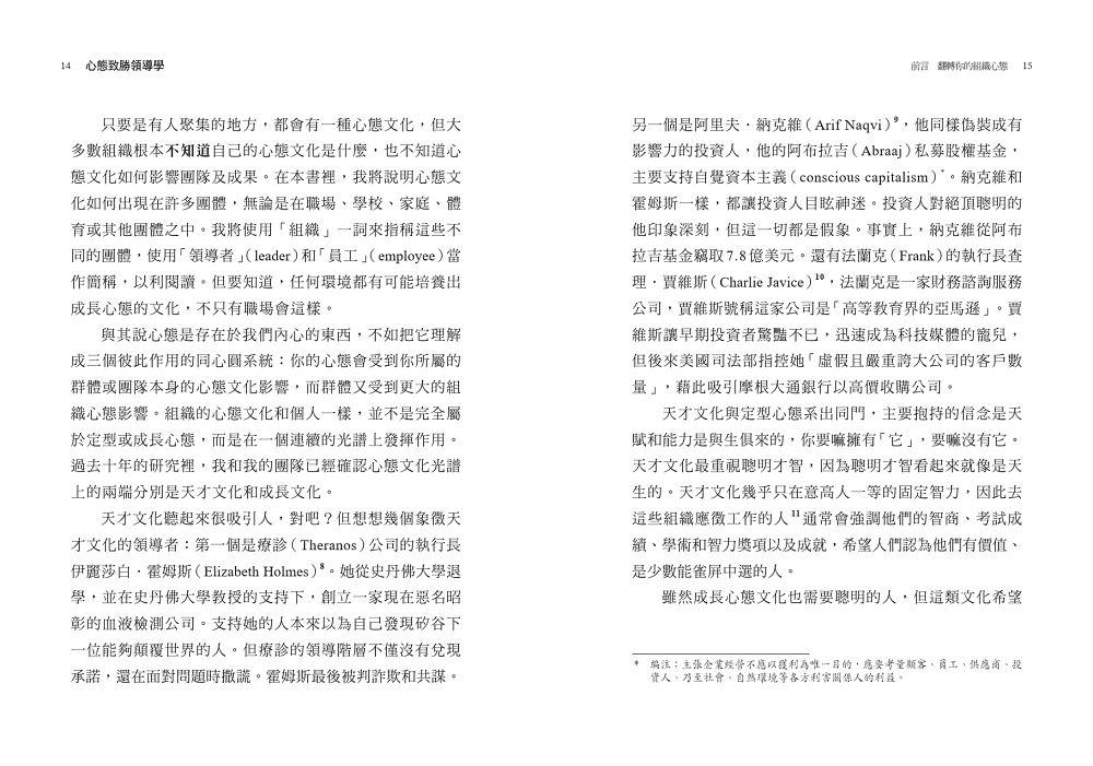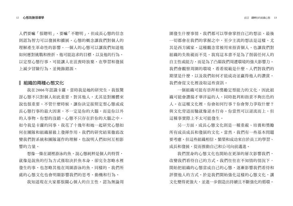 只要是有人聚集的地方,都會有一種心態文化,但大多數組織根本不知道自己的心態文化是什麼,也不知道心態文化如何影響團隊及成果。在本書裡,我將說明心態文化如何出現在許多團體,無論是在職場、學校、家庭、體育或其他團體之中。我將使用「組織」一詞來指稱這些不同的團體,使用「領導者」(leader)和「員工」 (employee) 當作簡稱,以利閱讀。但要知道,任何環境都有可能培養出成長心態的文化,不只有職場會這樣。
