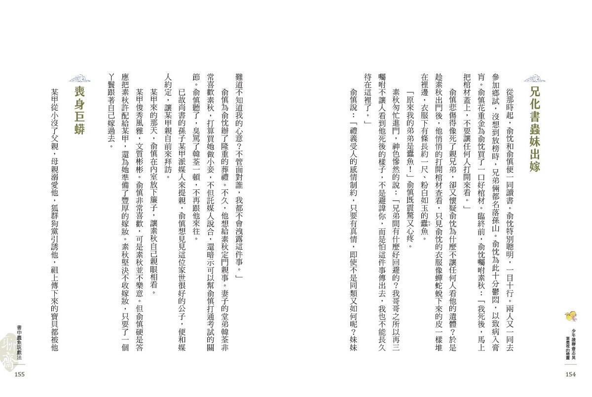 此外,「少年讀聊齋志異」系列雖然宣稱是給孩子們的讀物,但文字卻不會讓人感到幼稚和淺薄,甚至篇末的「《聊齋》裡的祕密」,根本可以當成一則簡單的小論文,不僅交代了蒲松齡的創作緣由與技巧,還考證與分析了文本的內容。