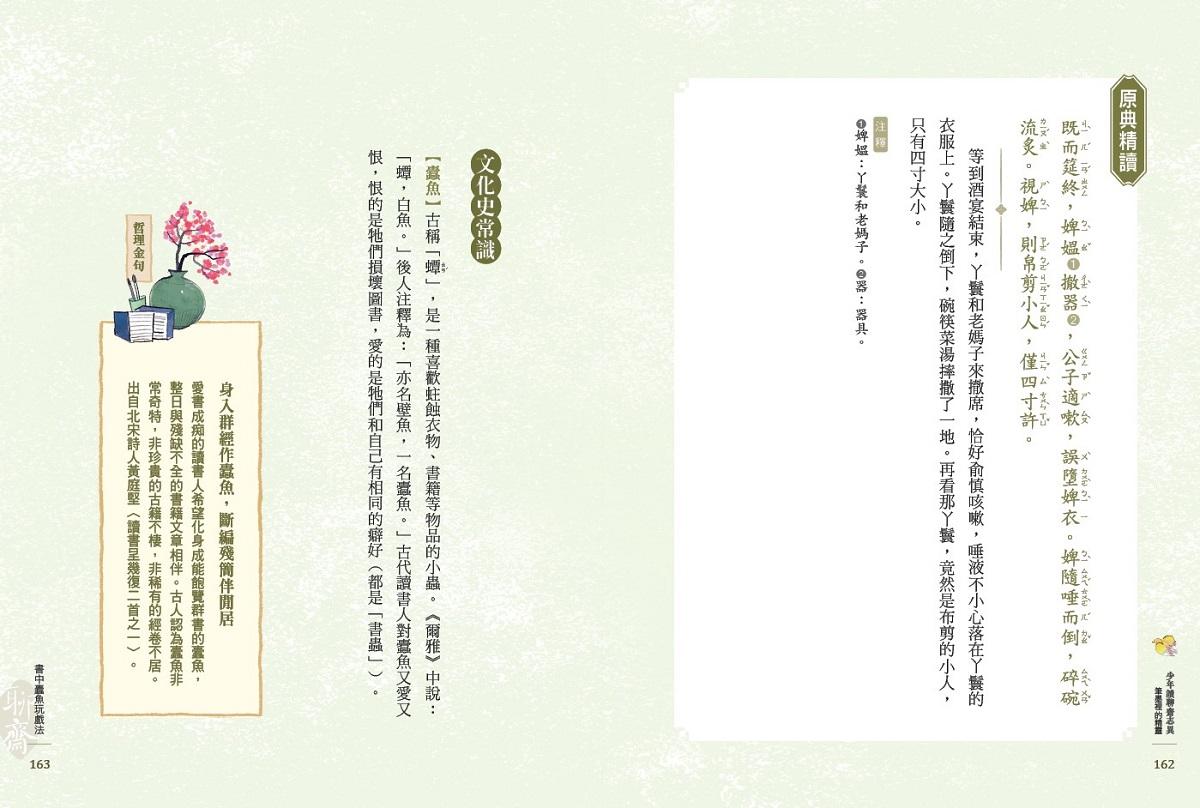 2)原典精讀:採用「原文節選+生難注釋+白話翻譯」架構,欣賞精典片段,熟悉文言文語感。