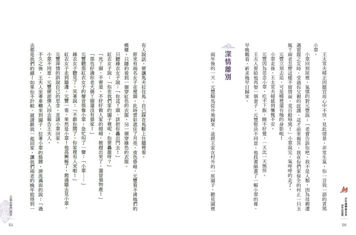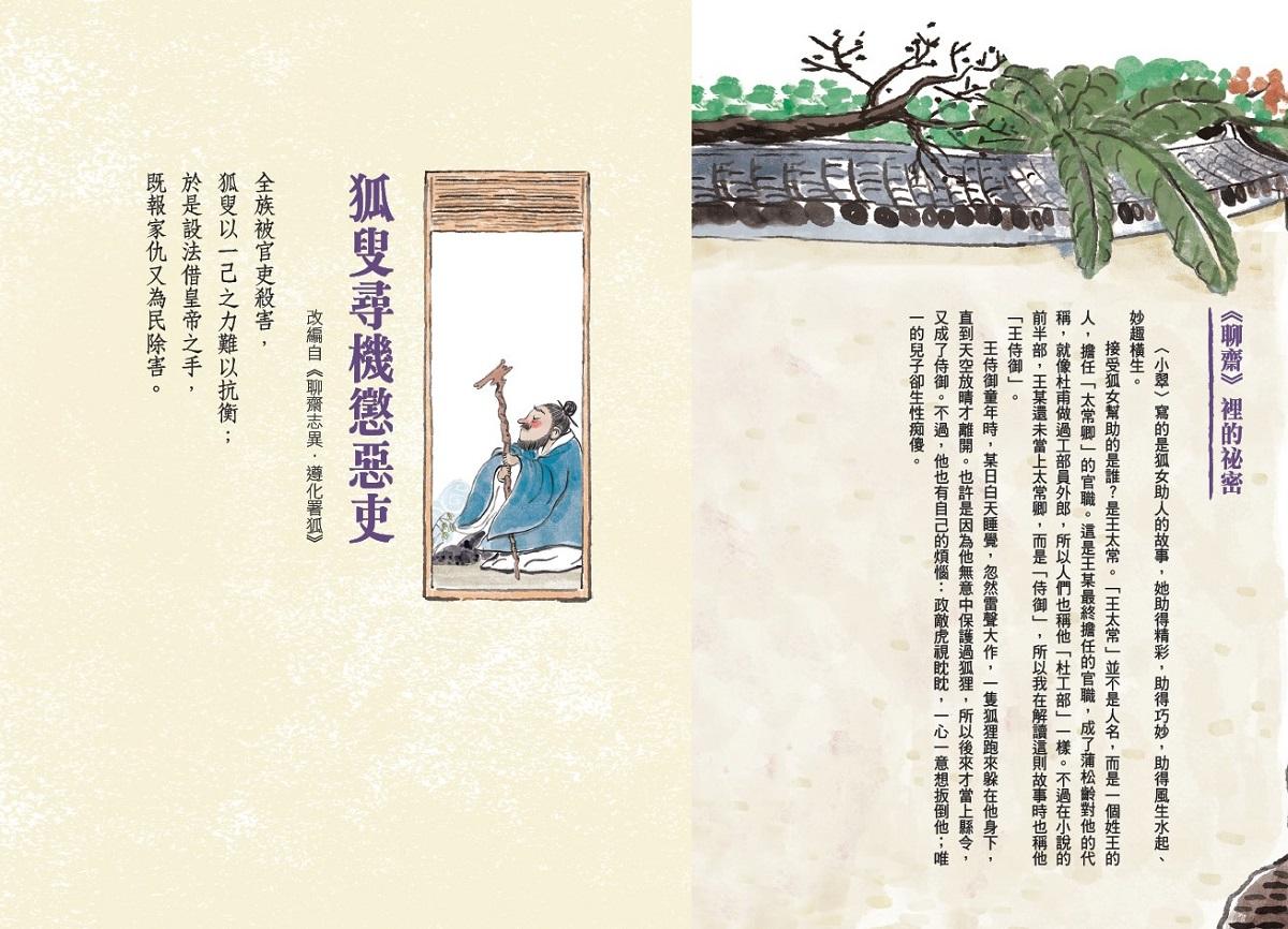 這當然是體貼的編排,「少年讀聊齋志異」系列共分成三輯:神奇的狐狸、筆墨裡的精靈、走進大千世界。從能幻化成人形的狐狸與精靈,再到不可思議的奇聞異事,裡面沒有讓人半夜睡不著覺的恐怖鬼故事,什麼血腥、殘酷的暴力情節也不會出現,純粹就是將想像力拓展到不屬於人類的國度裡,然後試圖塑造一個理想的社會關係。