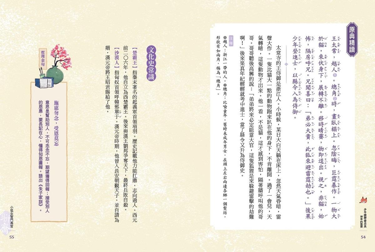 為了讓讀者也能原汁原味的品讀原著,每篇故事說完後還有「原典精讀」的設計,大約百字以內的原文,輔以譯注,分量不多。建議讀到這兒務必慢下來細細的讀,出聲音的讀,必能感受原作者蒲松齡用詞用語的精鍊,也能藉此累積閱讀文言文的實力。除此之外,每篇還有「文化史常識」,將該篇故事中出現的詩詞、典故、人物等加以介紹,帶給讀者一種「加碼」的收穫。