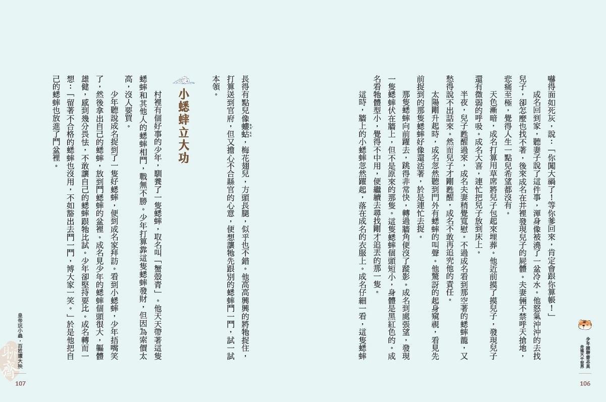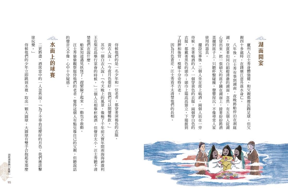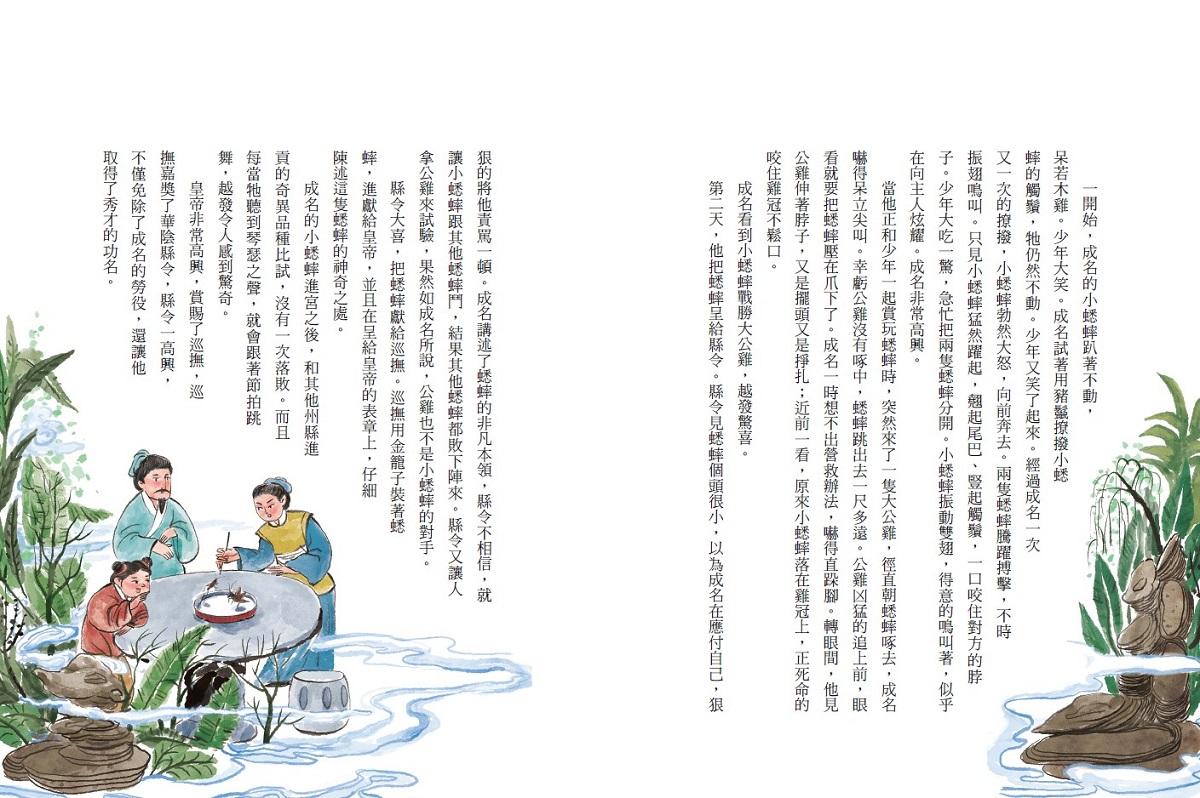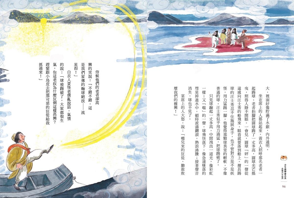 我喜歡作者為各個篇章重新下的篇名,〈親兄弟不如狐朋友〉、〈彩翼翩翩為人來〉、〈洞庭湖面踢「足球」〉、〈畫匹駿馬騎上跑〉、〈三百多年前的「虛擬世界」〉等等,有現代感的趣味、又有古典的優美。每篇故事一開始都用幾句短語勾勒出「劇情大要」,有如預告片的讓人想展書閱讀;故事並非完全依原著逐字逐句翻譯,作者顯然針對兒童少年的特點有所斟酌,改寫後的故事既要淺顯易懂,又要保留原著的文學品味,十分難得。