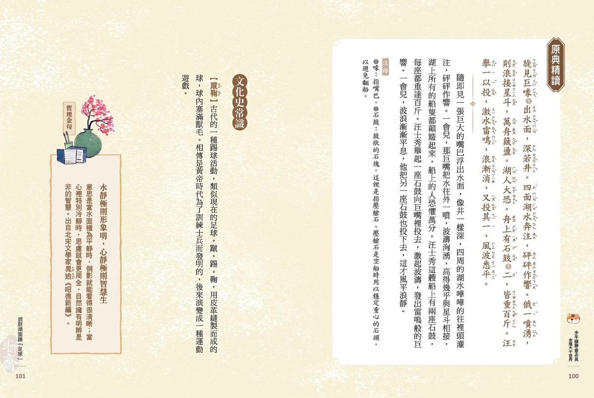 為了讓讀者也能原汁原味的品讀原著,每篇故事說完後還有「原典精讀」的設計,大約百字以內的原文,輔以譯注,分量不多。建議讀到這兒務必慢下來細細的讀,出聲音的讀,必能感受原作者蒲松齡用詞用語的精鍊,也能藉此累積閱讀文言文的實力。除此之外,每篇還有「文化史常識」,將該篇故事中出現的詩詞、典故、人物等加以介紹,帶給讀者一種「加碼」的收穫。