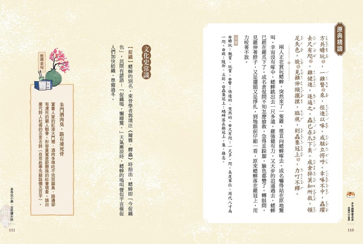 2)原典精讀:採用「原文節選+生難注釋+白話翻譯」架構,欣賞精典片段,熟悉文言文語感。