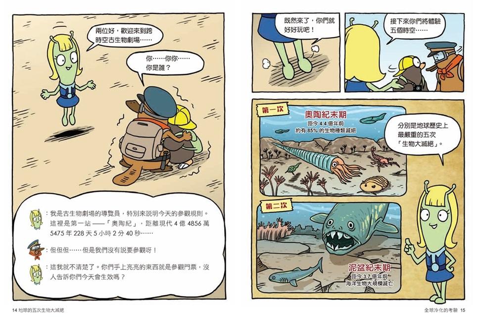 還記得上一集達克比和小博離開太空船前,被來自黏巴達星球、辦事超不牢靠的外星人嘍囉貼上神祕的發光石頭嗎?原來那竟然是結合超先進虛擬實境技術的「跨時空古生物劇場」參觀門票!達克比和小博將被迫重返地球歷史上五次規模最大的生物滅絕現場,見證生物演化史上最關鍵的時刻──它們分別是距今4.4億年的奧陶紀末期、3.7億年前的泥盆紀末期、2.5億年前的二疊紀末期、2億年前的三疊紀末期,以及6500萬年前的白堊紀末期。