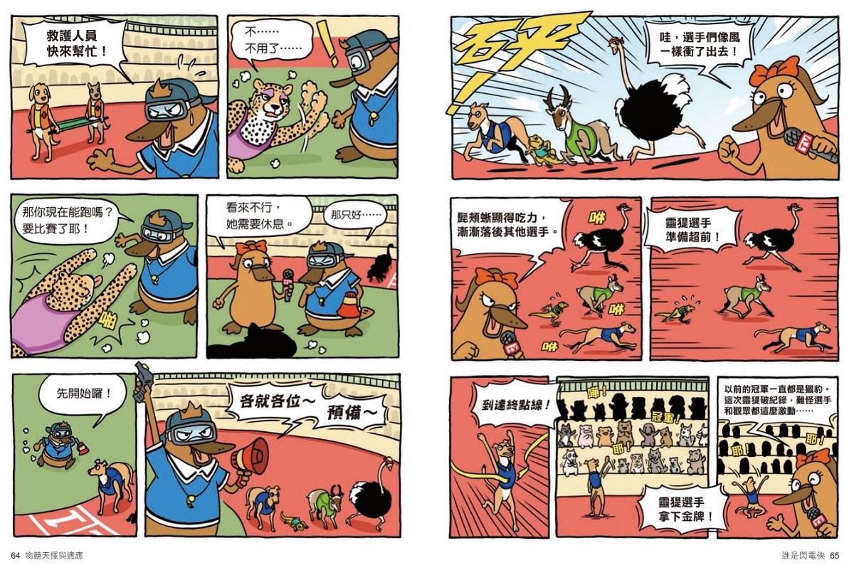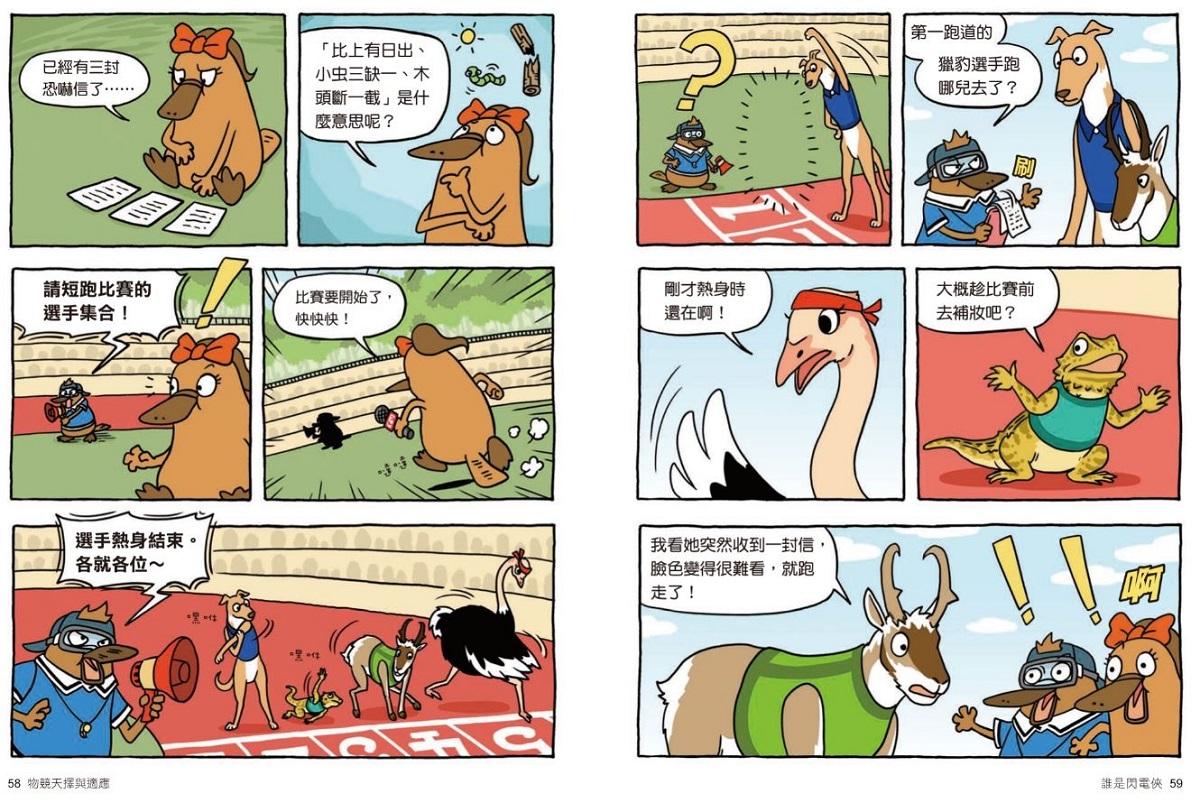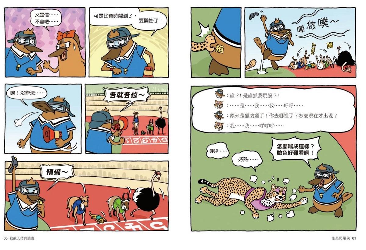 從第一集動物保護色,而後育兒行為、動物世界的射擊高手、「聲音」捕食的動物、動物們的假死、演化、古生物滅絕……到這次第八集──物競天擇與適應,這些題目就連課堂上都要花許多時間著墨教學,可【達克比辦案】就有這樣的魔力,在翻開後就停不下來的閱讀中,藉由動物的運動會收到警告信,緊扣奧運會的時事趣味,卻輕鬆帶出天擇、性擇、人擇、共演化的大議題。講到天擇,腦袋裡能跳出書中幾幅生動有趣的漫畫格;對於書中舉的所有例子,都能如數家珍。難的不是講多艱深的知識,而是有趣味、深入淺出將困難的理論概念,用幾格漫畫說得清清楚楚,要忘都難。