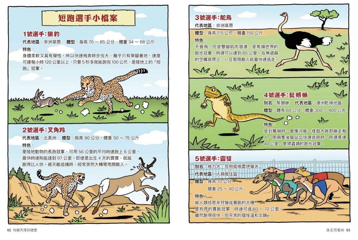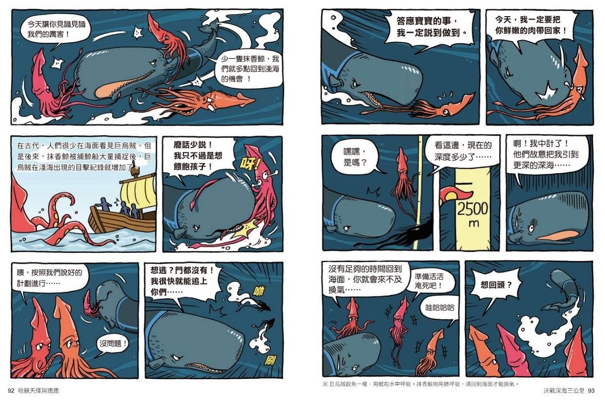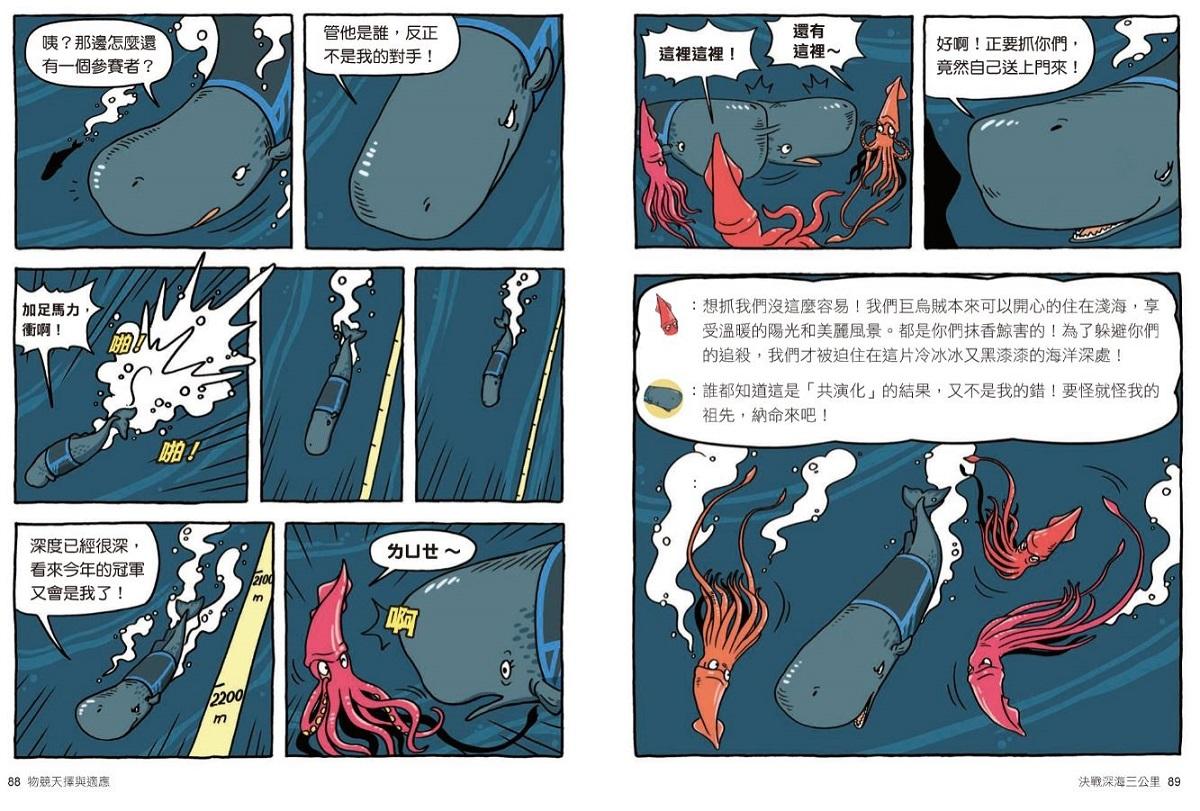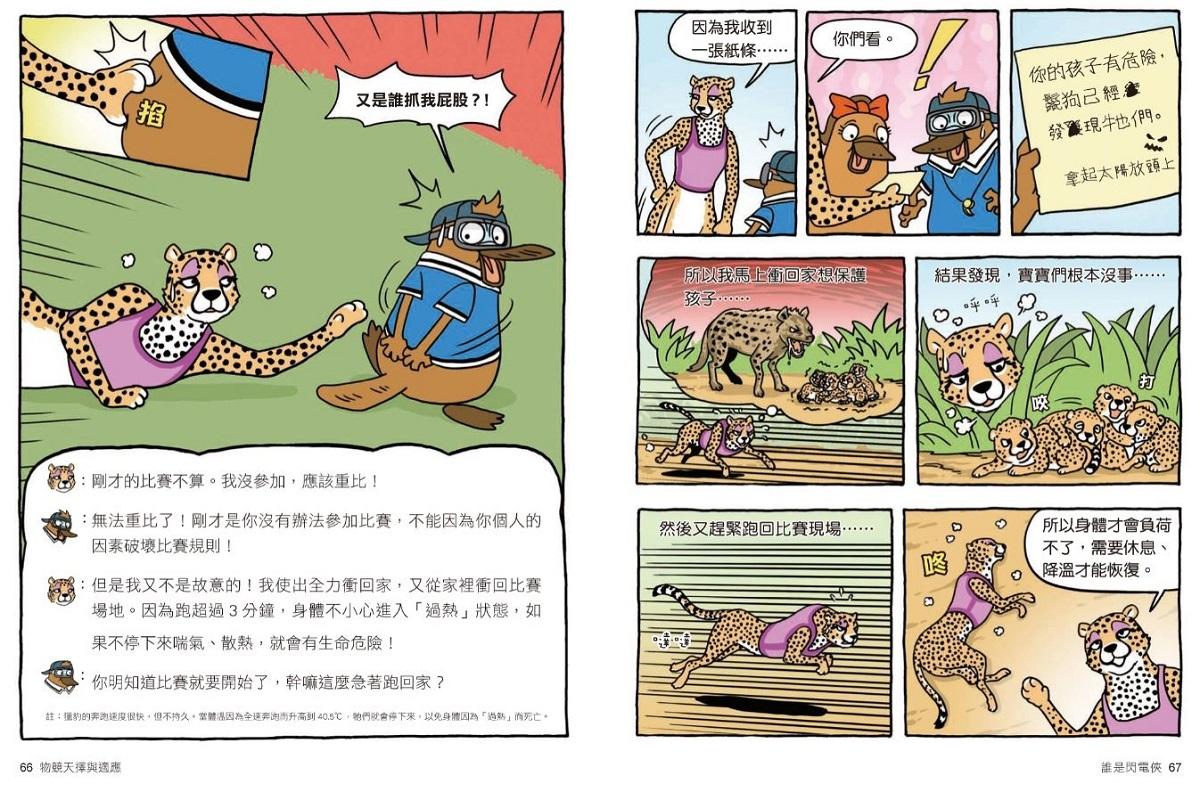 從第一集動物保護色,而後育兒行為、動物世界的射擊高手、「聲音」捕食的動物、動物們的假死、演化、古生物滅絕……到這次第八集──物競天擇與適應,這些題目就連課堂上都要花許多時間著墨教學,可【達克比辦案】就有這樣的魔力,在翻開後就停不下來的閱讀中,藉由動物的運動會收到警告信,緊扣奧運會的時事趣味,卻輕鬆帶出天擇、性擇、人擇、共演化的大議題。講到天擇,腦袋裡能跳出書中幾幅生動有趣的漫畫格;對於書中舉的所有例子,都能如數家珍。難的不是講多艱深的知識,而是有趣味、深入淺出將困難的理論概念,用幾格漫畫說得清清楚楚,要忘都難。
