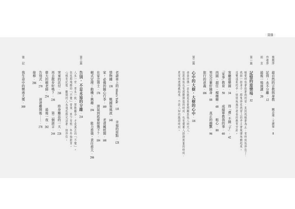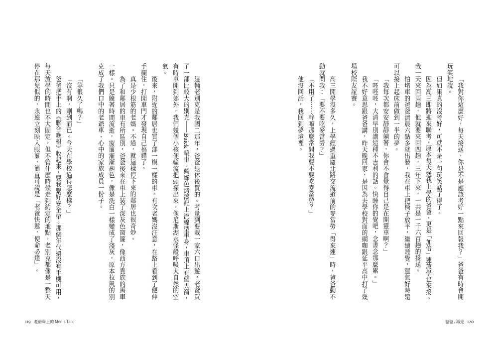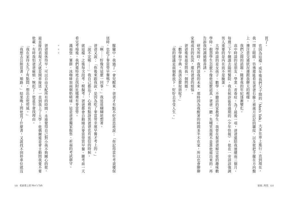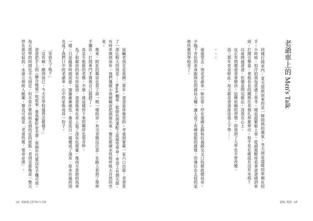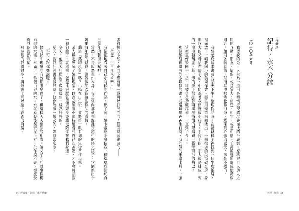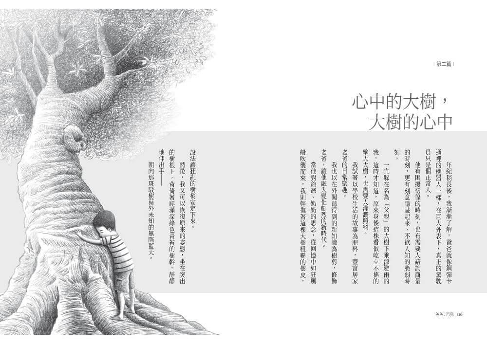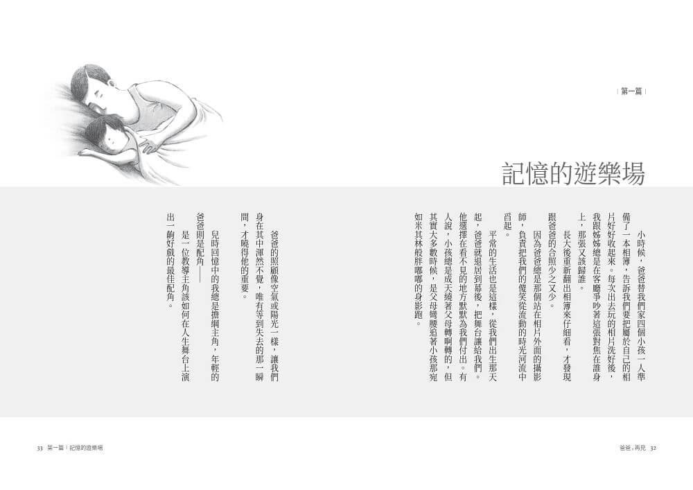 「睡覺時他會拍著我的背,直到我睡著為止;有時候他停住了,我扭一扭身子,那隻停在我背上的手又會規律地動起來。這雙溫柔的手,悄悄地施行老爸的教育方針,朝他期望的方向開鑿渠道,我則不自覺地順著前進。」