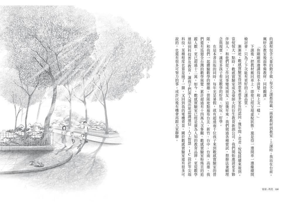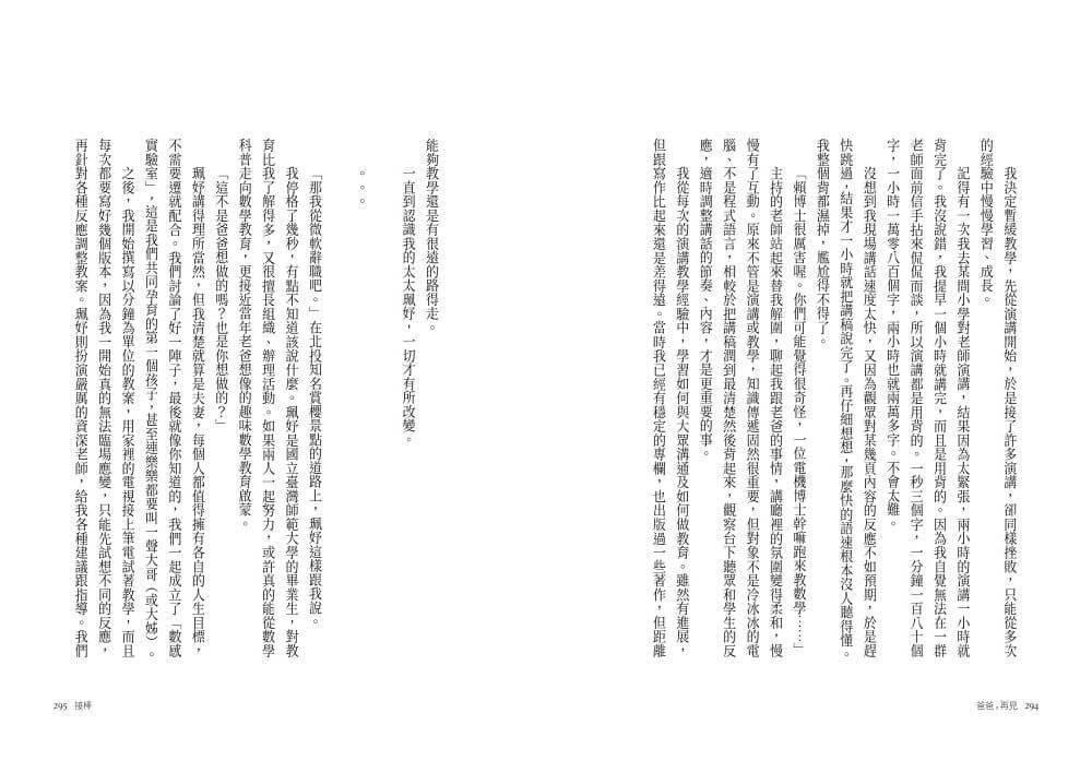 十五年過去,我多了「爸爸」的身分。每天早上送兩個孩子上學,然後回到我的工作崗位,就像當年老爸坐在客廳沙發上手寫教案那樣,想辦法要讓更多孩子喜歡數學,學好數學。