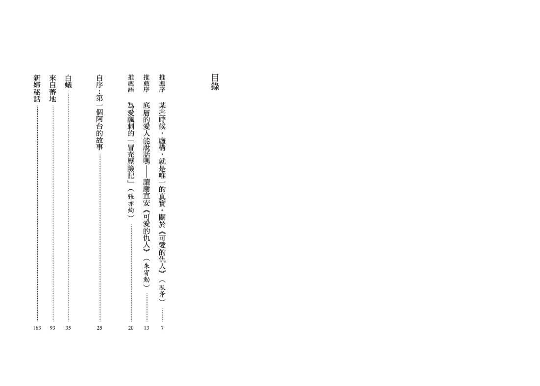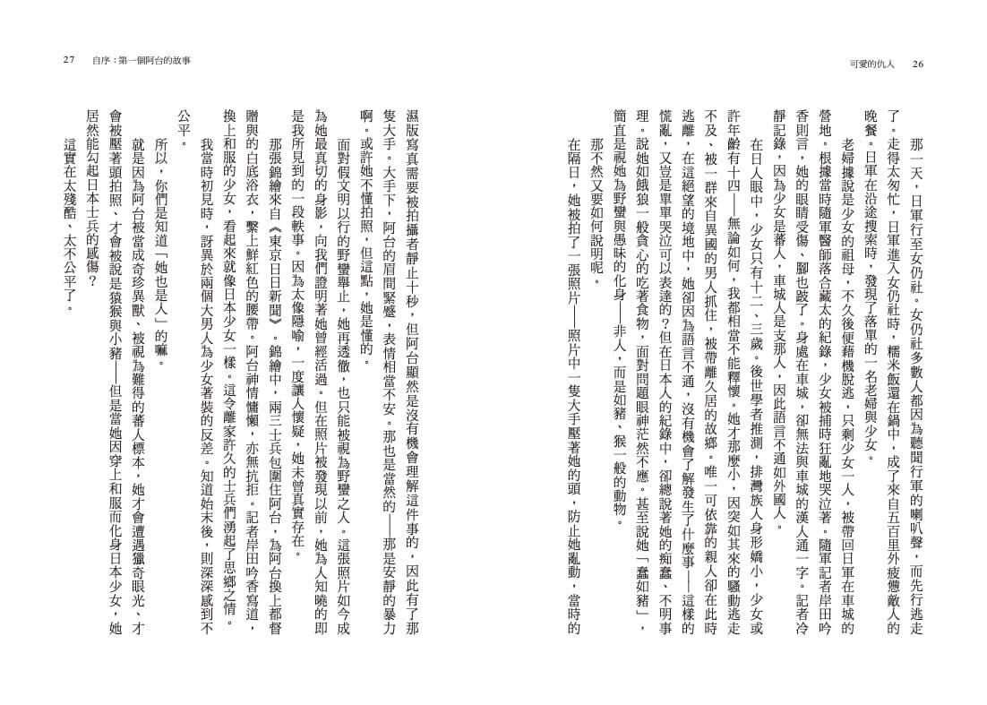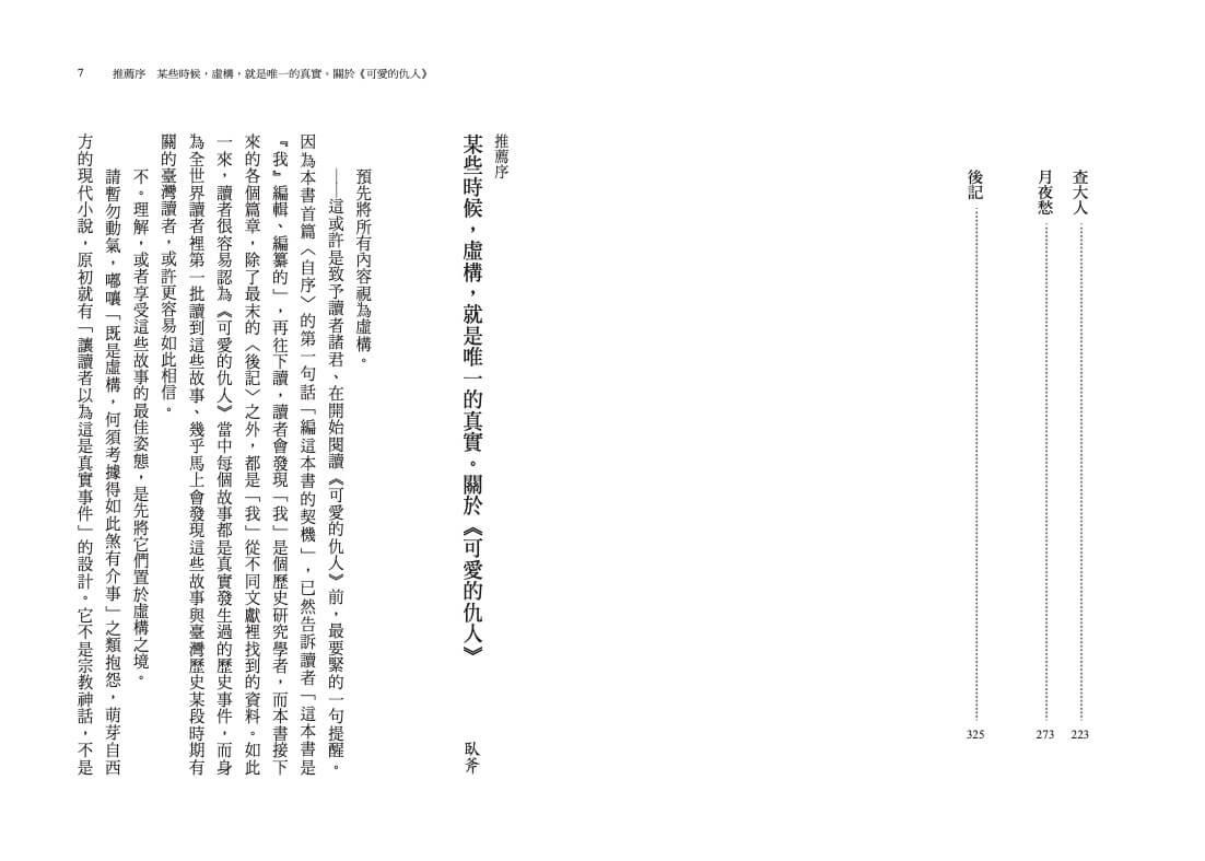 ──這或許是致予讀者諸君、在開始閱讀《可愛的仇人》前,最要緊的一句提醒。因為本書首篇〈自序〉的第一句話「編這本書的契機」,已然告訴讀者「這本書是『我』編輯、編纂的」,再往下讀,讀者會發現「我」是個歷史研究學者,而本書接下來的各個篇章,除了最末的〈後記〉之外,都是「我」從不同文獻裡找到的資料。如此一來,讀者很容易認為《可愛的仇人》當中每個故事都是真實發生過的歷史事件,而身為全世界讀者裡第一批讀到這些故事、幾乎馬上會發現這些故事與臺灣歷史某段時期有關的臺灣讀者,或許更容易如此相信。