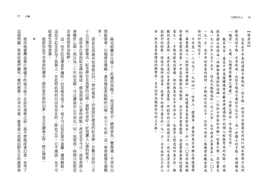 首篇故事〈白蟻〉裡的建築學家中井惠參與了臺灣總督府廳舍的興建工程,因此愛上了美麗的日本官員寡婦永久子,卻慢慢發現永久子藏著離奇的身世秘密⋯⋯