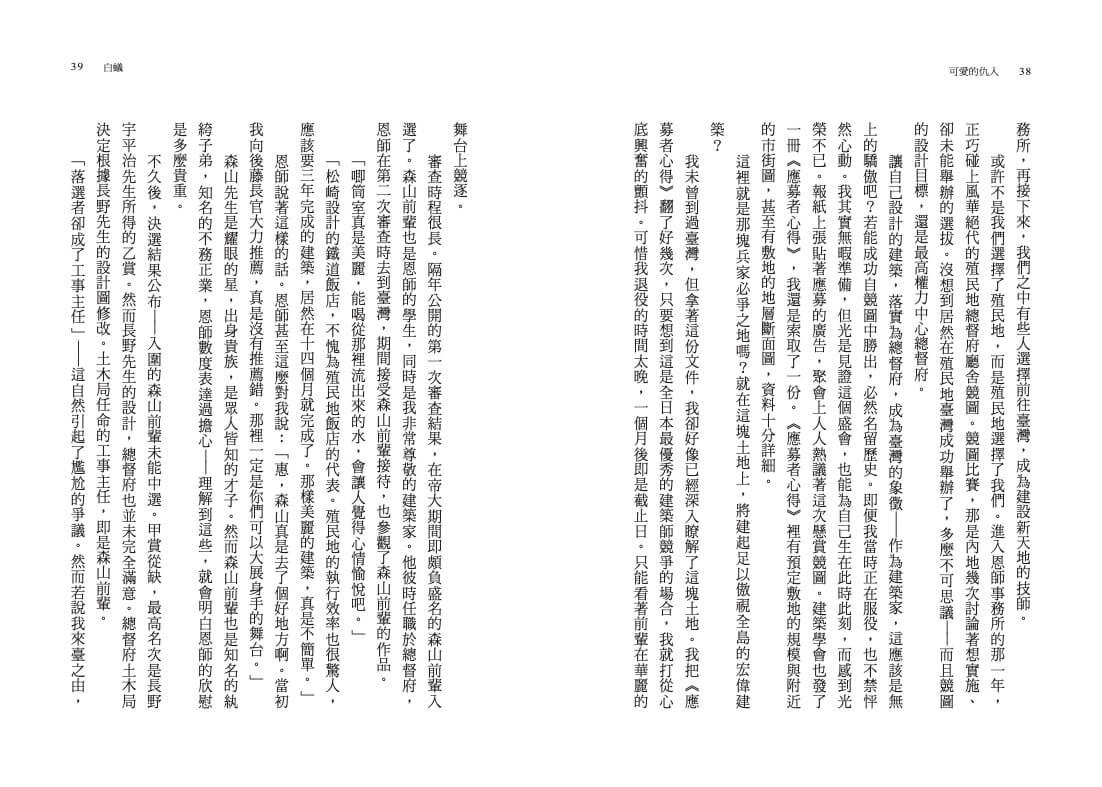 長野先生如此憤恨,固然有個人因素。但我也不禁想到,他曾經花費至少數個月的時間,想像著新總督府的樣子,伏案一筆一畫繪製出如今的設計圖,每一張都是無數心血……不只是他,森山前輩也是如此,參與競選的片岡先生、櫻井先生……所有人都是如此。這樣想,或許會被笑思慮不周吧,然而我仍忍不住單純的覺得,足以令如此眾多的精英建築家為此傾注心神,殖民地臺灣絕不會是次等之地。