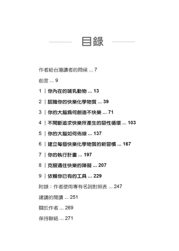更重要的是,作者以深刻的觀察和幽默的口吻,舉出日常生活中實際的範例,讓我們能夠瞭解這些快樂化學物質對我們及周遭人的影響。作者也提供確實可行的方法,教導讀者如何在45天內學會重新佈局大腦裡的神經元線路,享受更快樂、健康的人生!