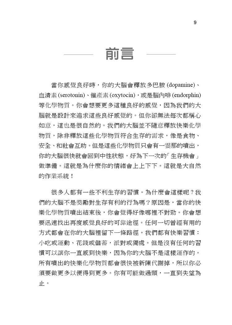 本書開宗明義地闡述我們的大腦是經過演化而來,以生存作為最主要的目標。當我們做出符合生存的事情,大腦就會釋放快樂化學物質來獎勵我們。這四種快樂化學物質分別是激勵尋求被人尊重的血清素 (Serotonin),勇於探索的多巴胺 (Dopamine),愛戀子女、配偶,甚至擴及群體的催產素 (Oxytocin),以及在受傷時暫時掩蓋疼痛,讓你得以逃至安全處所的腦內啡 (endorphin)。