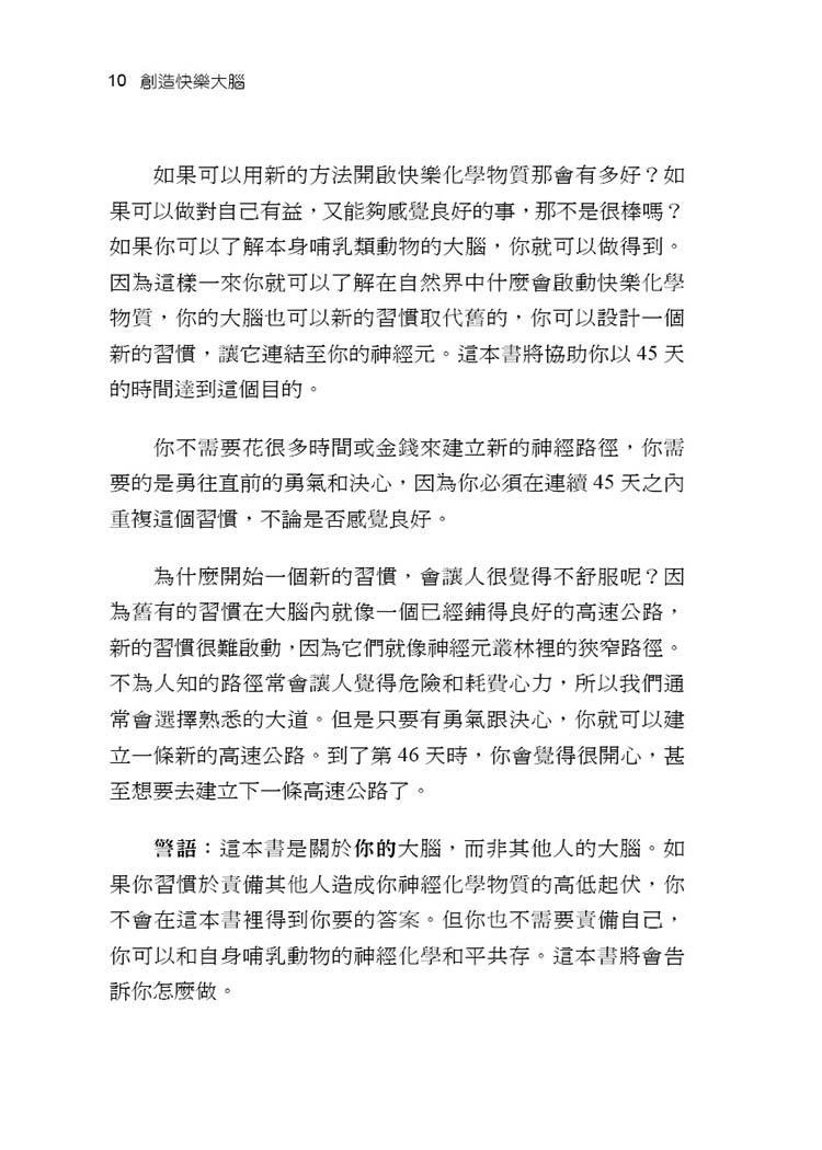 如果可以用新的方法開啟快樂化學物質那會有多好?如果可以做對自己有益,又能夠感覺良好的事,那不是很棒嗎?如果你可以了解本身哺乳類動物的大腦,你就可以做得到。因為這樣一來你就可以了解在自然界中什麼會啟動快樂化學物質,你的大腦也可以新的習慣取代舊的,你可以設計一個新的習慣,讓它連結至你的神經元。這本書將協助你以45天的時間達到這個目的。