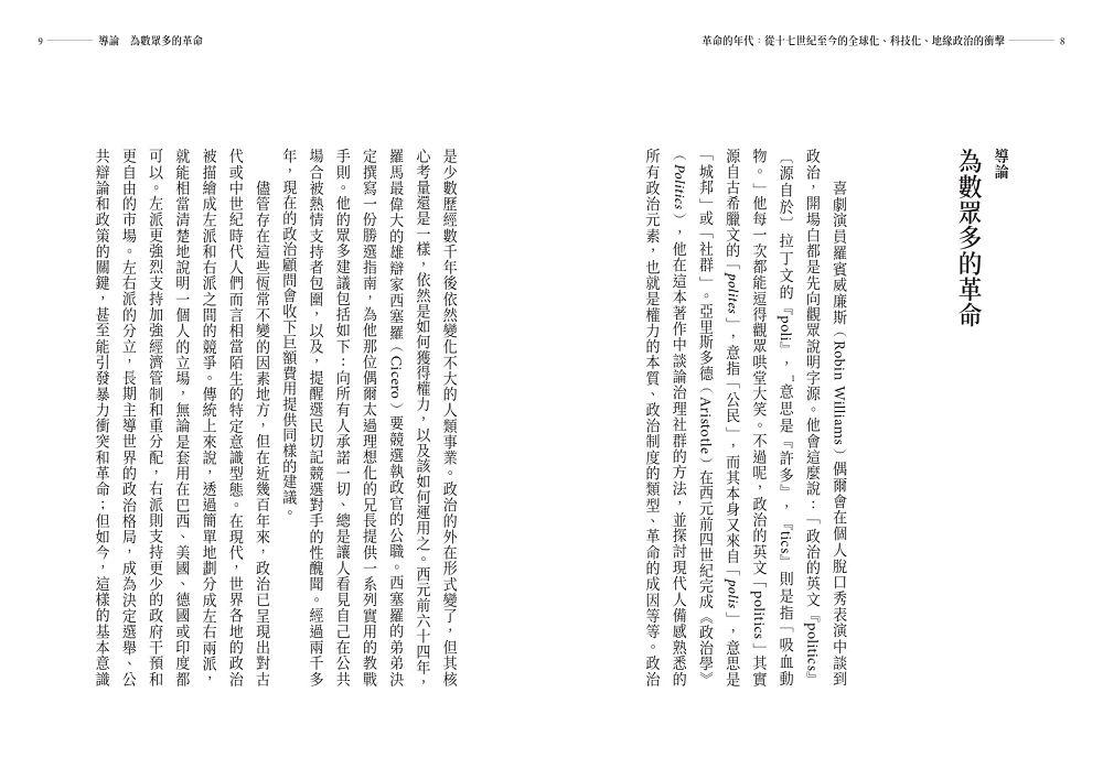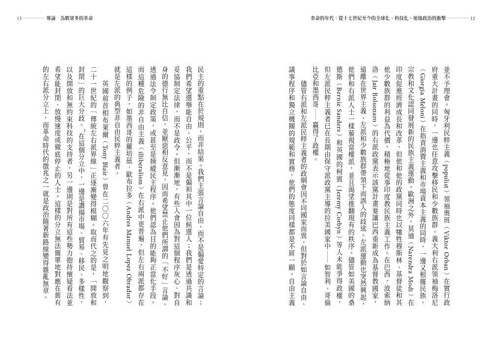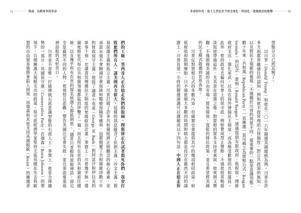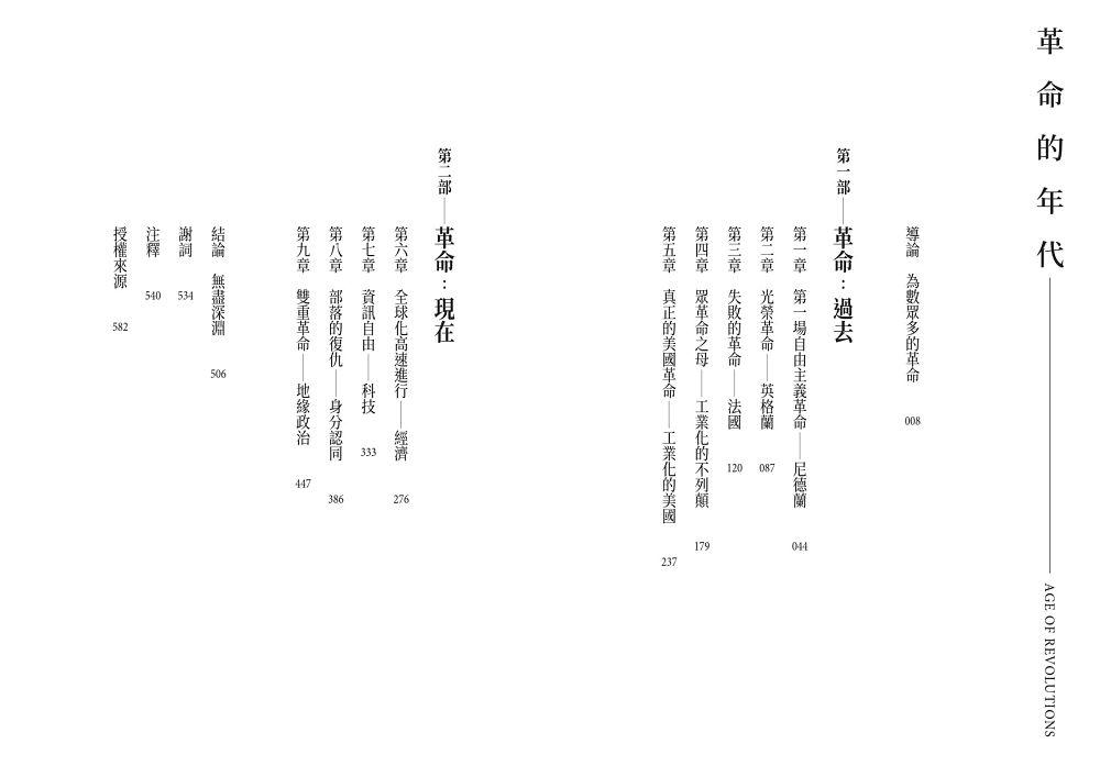 我們的時代是符合「revolution」通常意涵的革命時代。無論你看向哪裡,都能看到驟然的激進改變。過去一直看似穩定而熟悉的國際體制,現在正在快速改變,並面臨了兩項挑戰:崛起的中國,以及抱持復仇主義的俄羅斯。在各個國家內部,隨著超越傳統左右派分立的新運動逐漸占上風,可以看到舊有的政治秩序遭到徹底顛覆。在經濟方面,共產主義瓦解後所形成的以自由市場和自由貿易為主的共識遭到了推翻,而關於社會和經濟體該如何駕馭這些未知領域則存在極大的不確定性。所有這一切的背景是數位革命的全面開展,以及人工智慧的出現,並伴隨著全新且具破壞性的後果。
