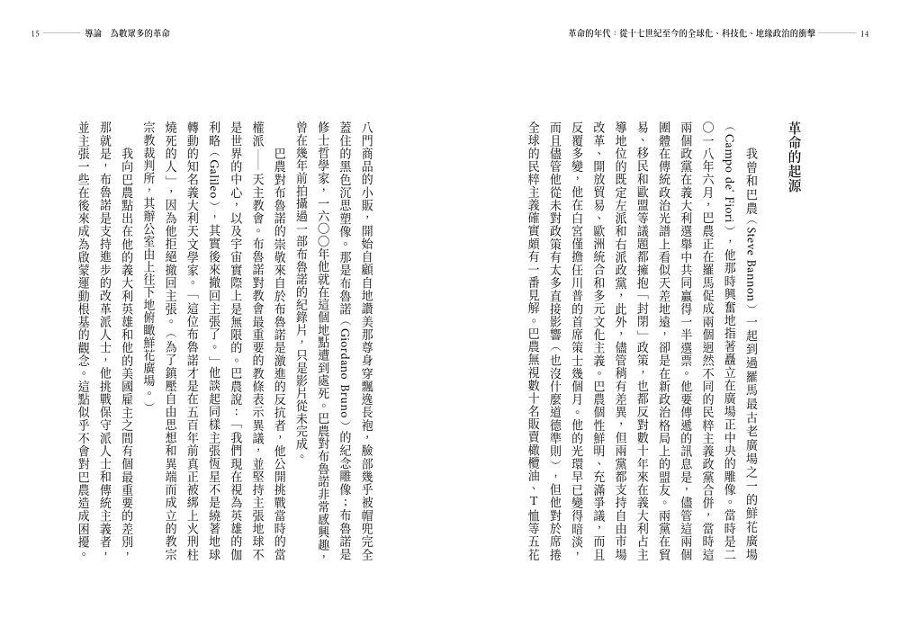 我向巴農點出在他的義大利英雄和他的美國雇主之間有個最重要的差別,那就是,布魯諾是支持進步的改革派人士,他挑戰保守派人士和傳統主義者,並主張一些在後來成為啟蒙運動根基的觀念。這點似乎不會對巴農造成困擾。對巴農而言,布魯諾是大無畏的自由思想者,反抗既有的權力架構。巴農的骨子裡就是革命份子,想要推翻當權者,並從任何角度加以攻擊。他欣賞列寧(Lenin)的革命戰術。巴農承認,自己之所以被布魯諾吸引,是因為他相信在動盪的時刻,態度強硬的激進主義(radicalism)是唯一選擇。巴農說:「索羅斯(George Soros)某天在談到義大利選舉時,曾說我們都生活在革命時代。我也這麼想。我想大家都正在目睹一場根本性的重建。」