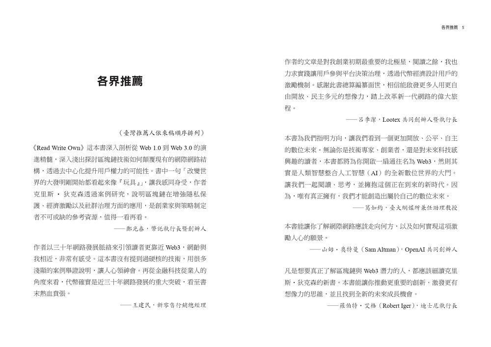 凡是想要真正了解區塊鏈與WEB3潛力的人,都應該細讀克里斯‧狄克森的新書。本書能讓你推動更重要的創新、激發更有想像力的思維,並且找到全新的未來成長機會。──羅伯特‧艾格(Robert Iger),迪士尼執行長