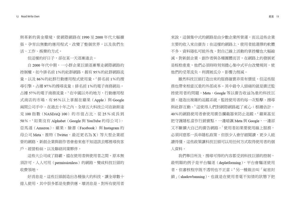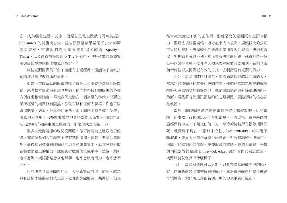 我把網際網路的歷史看成一部三幕劇。每一幕都以當時主流的網路架構命名。第一幕是1990至2005年左右的「唯讀時代」(read era),當時網際網路剛剛誕生,協定網路將資訊分享給每一個人。人們只要在全球資訊網瀏覽器中輸入幾個單詞,就能在網站上閱讀任何主題。第二幕是大約2006至2020年間的「讀寫時代」(read-write era),企業網路將發表的權力分享給每一個人。人們只要登入社群網路之類的服務,都可以寫作並發表文字,讓廣大受眾看見自己的作品。今日,一種新的架構正要將網際網路推向第三幕。