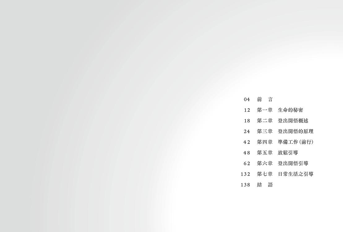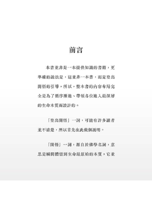 本書並非是一本提供知識的書籍,更準確的說法是,這並非一本書,而是登出開悟的引導,所以,整本書的內容布局完全是為了循序漸進、帶領各位進入最深層的生命本質而設計的。