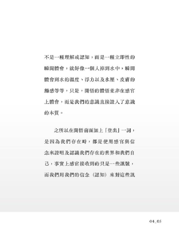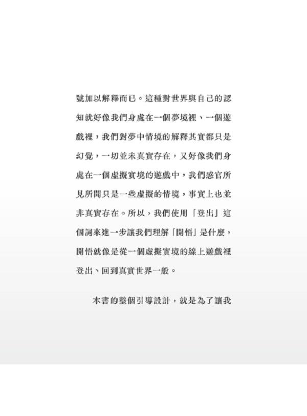 本書的整個引導設計,就是為了讓我們能登出開悟、回到真實的實相。至於真實到底是什麼,我們並不需要用文字去詮釋,而是希望大家能親自去體悟。
