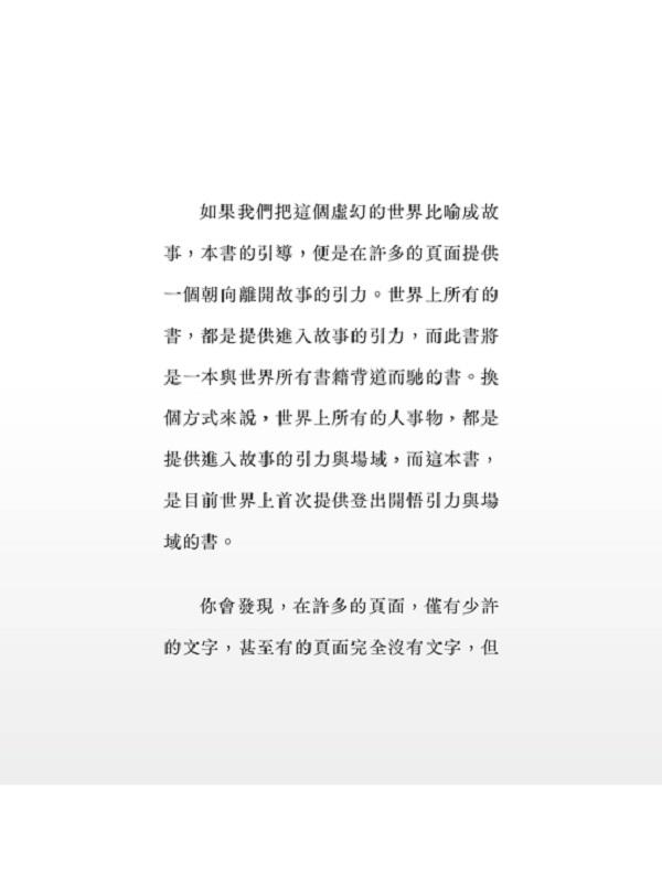 你會發現,在許多的頁面,僅有少許的文字,甚至有的頁面完全沒有文字,但如果你是由前面往後閱讀,你將會被文字引導到一種沒有解釋、沒有意義而單純存在的狀態,這時候,在空白的頁面裡,正好埋藏了強大的空之場域,正好引領你契入這種離於故事的空之場域而引發登出開悟的可能性,這是此引導工具真正的作用。所以,與其說這是一本書,不如將它視為一個引導登出開悟的工具。