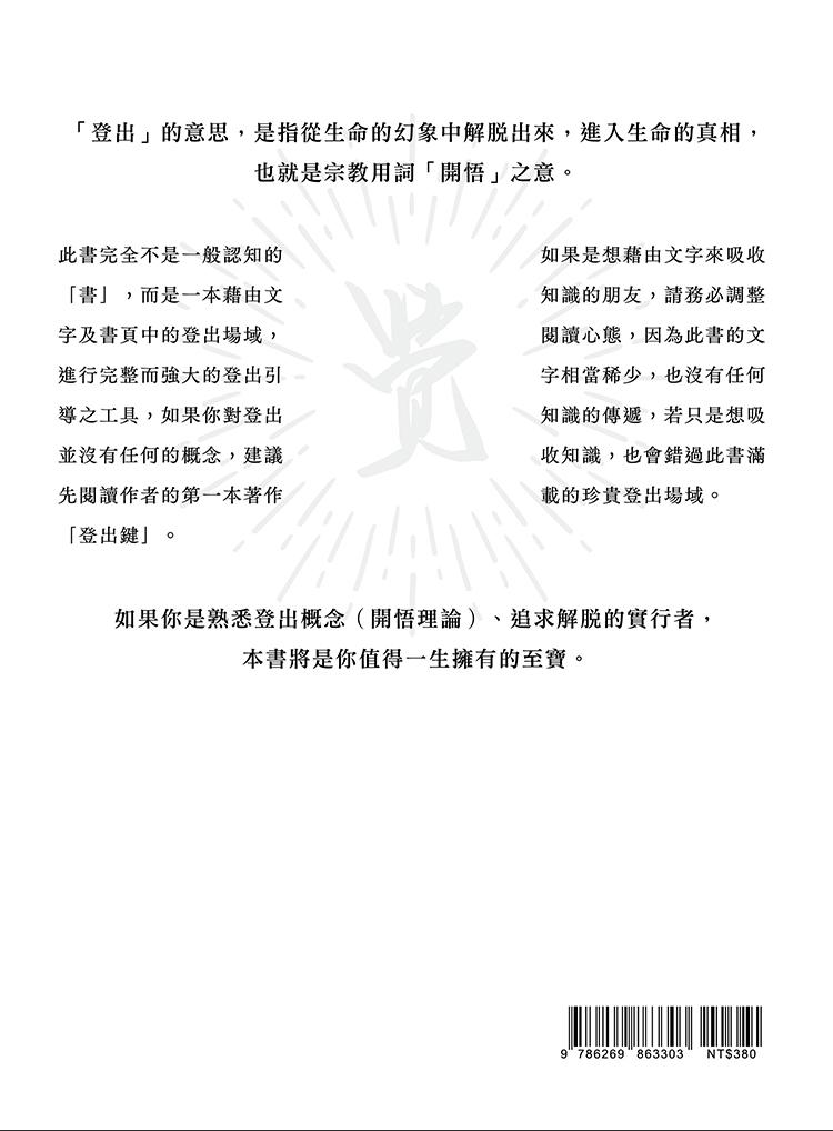 生命的真相,過往認為無法用任何言語徹底地傳遞,此書則完全打破這個認知的藩籬,藉由言語漸漸將你引導至無邊無際的登出場域,直接讓你體悟生命的真相。