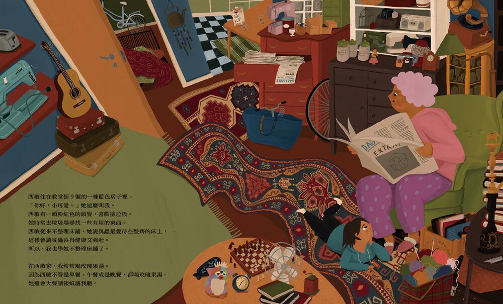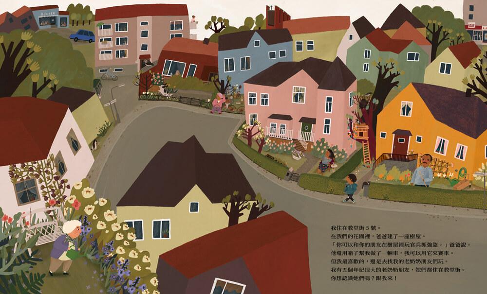 一個小男孩,住在教堂街,雖然爸爸幫他蓋了樹屋、用箱子做了車,但這些似乎都吸引不了他。小男孩最喜歡做的事還是去找他的五個老奶奶好朋友一起玩。