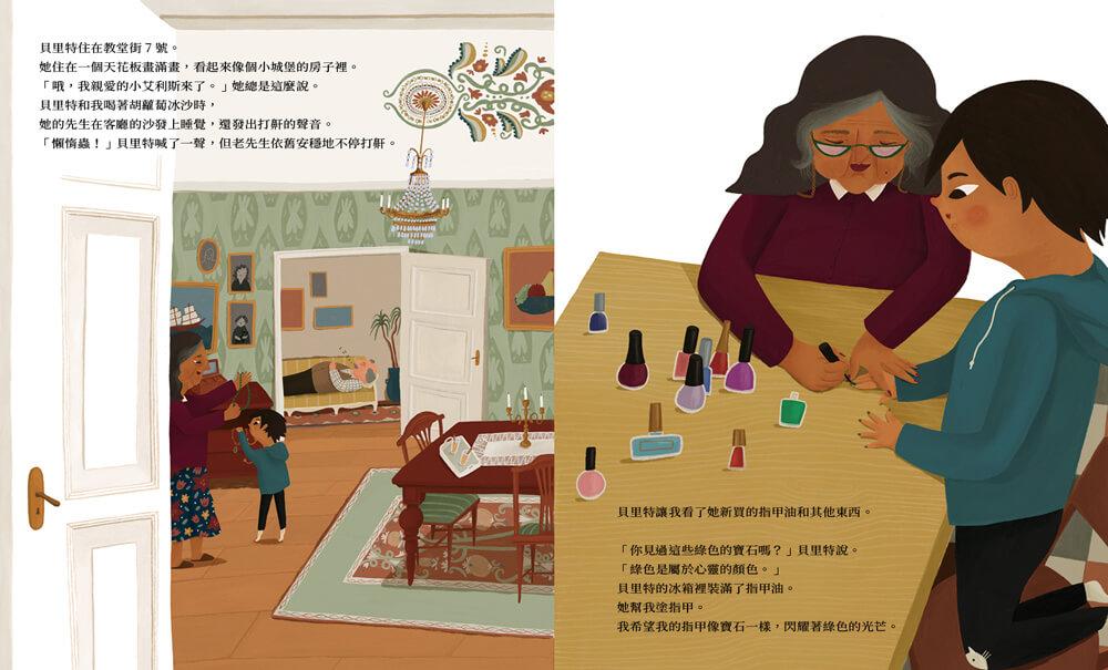 這五個老奶奶好朋友也住在教堂街,她們各個都很有個性,有人會教他擦指甲油,有人和他一起騎腳踏車、種花、做蛋糕,也有人只是跟他一起坐在搖椅上發呆、吃餅乾,這些看似細瑣的日常,引領小男孩一探大人世界的奧秘,也為他帶來許多生活上的小樂趣。值得一提的是,這些老奶奶住的房子也是各有特色,有人住在天花板畫滿畫的小城堡,有人住小紅磚房,也有人住在大型公寓裡或石頭造的房子裡。這些不同性格的老太太們和她們的房子,讓整本書營造出一種熱鬧多彩而豐富的氛圍。故事的轉折是其中一位和小男孩交情最好的老奶奶過世了,這個悲傷的事件帶給小男孩不小的衝擊,他也因此封閉自我好一陣子,所幸其他的老奶奶好朋友們依舊每天出現在他的生活裡,努力的用盡各種方式陪伴他度過這段悲傷時期。後來,過世的那位老奶奶住的房子搬進了一個小女孩,小男孩於是有機會也和自己年齡相仿的孩子交朋友,開始了另一段美好的友誼。