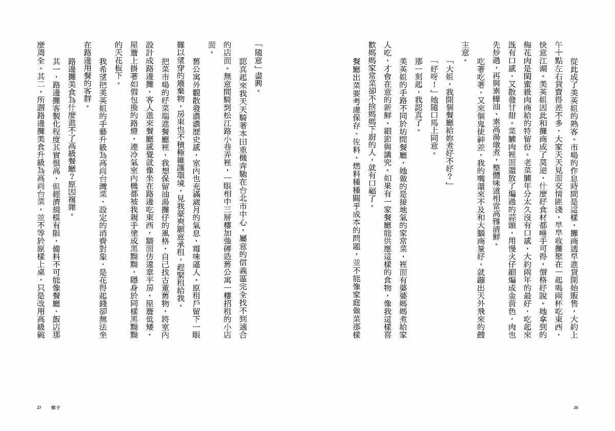 豐富的味道資料庫產生鏈接,互相激盪,不斷融合又展開。我進入了飲食新紀元。菜餚與配料、菜餚與醬料、菜餚與主食、菜餚與飲品,整席菜色的起承轉合……逐漸凝聚成形。不止吃宴席,吃路邊攤我也用同樣標準。街頭小吃用得著這麼講究的原則嗎?路邊攤上不了檯盤,不成大器?我覺得相反。街頭小吃單純、新鮮、非量產,更適用這麼講究的原則,也更容易辨識出其中濃淡配比的細微差異。