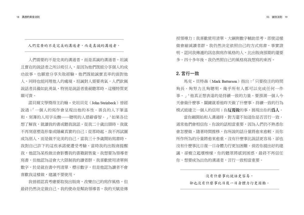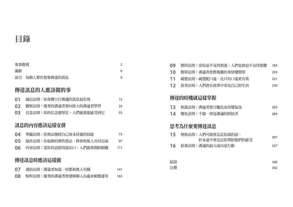 如同書中強調,內容為「王」,溝通為「后」。不論是要激勵員工、在會議上發言、進行部門簡報、教育學生、向一群人宣布消息、上台演講,或是在日常生活中和人交流,唯有善用溝通方法,才能有效達成目的、發揮最大影響力。