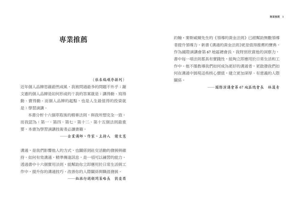 我誠摯地推薦這本書給所有渴望提升溝通能力的讀者。無論您是領導者、企業家,還是普通的職場人士,這本書都將成為您提升溝通技巧的重要資源。讓我們一起學習並實踐《溝通的黃金法則》,建立更好的連結,實現更有效的溝通。