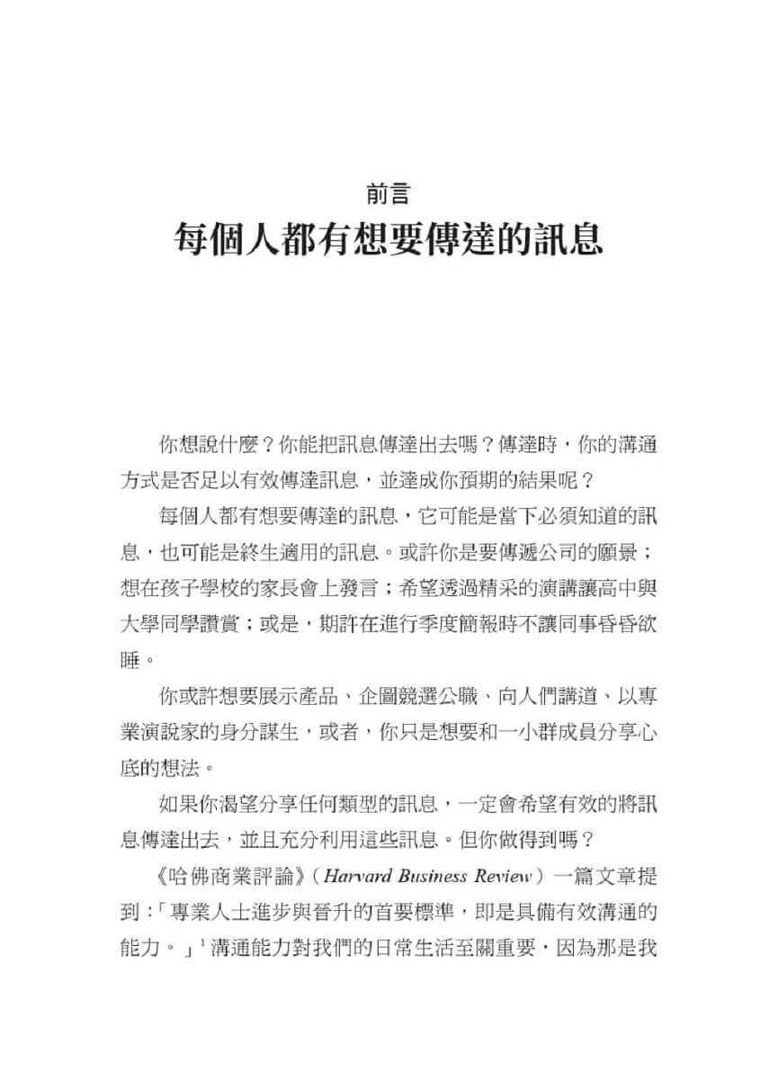 每個人都有想要傳達的訊息,它可能是當下必須知道的訊息,也可能是終生適用的訊息。或許你是要傳遞公司的願景;想在孩子學校的家長會上發言;希望透過精采的演講讓高中與大學同學讚賞;或是,期許在進行季度簡報時不讓同事昏昏欲睡。
