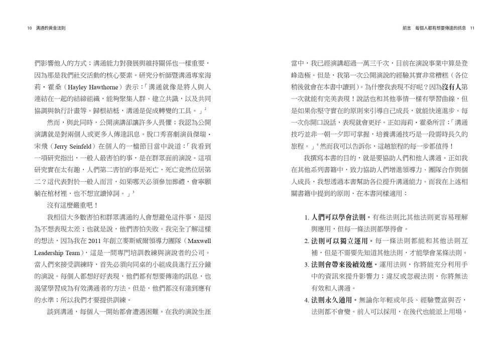 我撰寫本書的目的,就是要協助人們和他人溝通。正如我在其他系列書籍中,致力協助人們增進領導力、團隊合作與個人成長,我想透過本書幫助各位提升溝通能力。而我在上述相關書籍中提到的原則,在本書同樣適用: