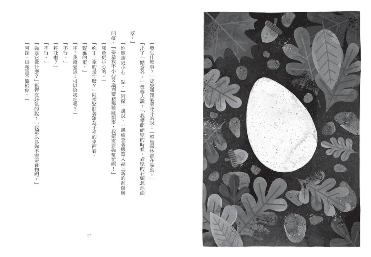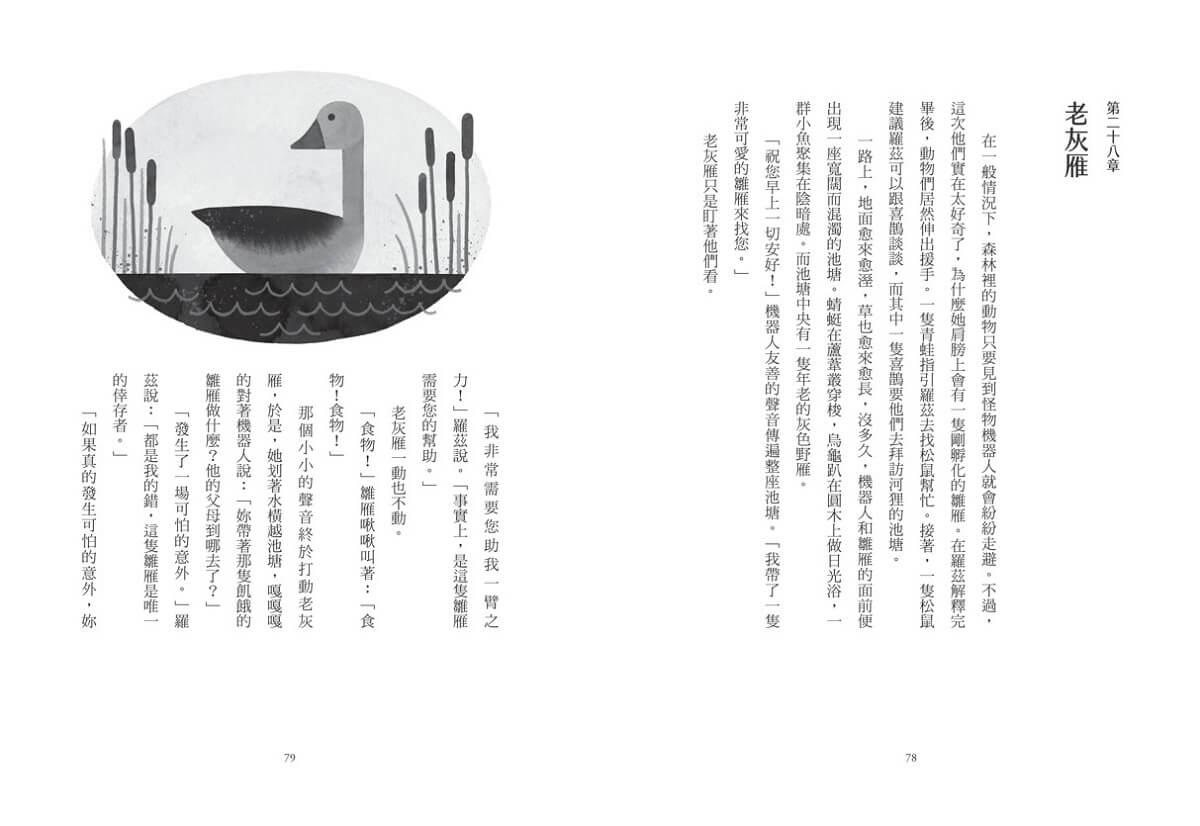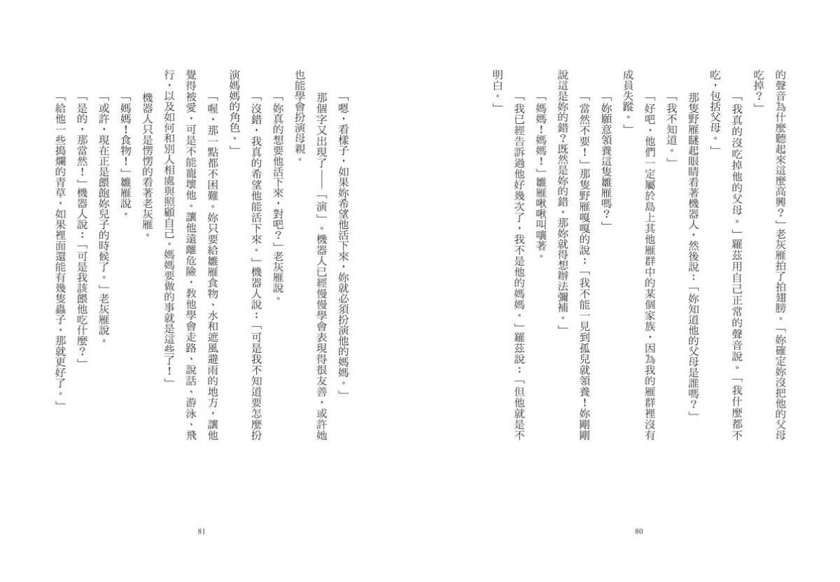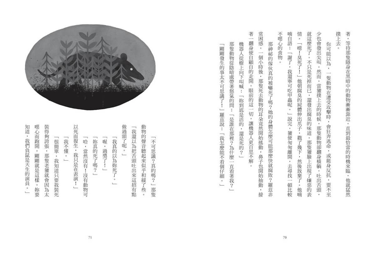 親愛的讀者,我得提醒你,羅茲完全不知道自己怎麼會來到這座島。她不知道自己是在工廠裡製造出來的,在搭乘貨輪飄洋過海前,一直存放在一間倉庫裡。她不知道一場颶風吞噬了貨輪,留下包裝她的木箱在波濤中漂浮,過了好幾天才沖上岸。她也不知道自己是由那一群好奇的海獺意外啟動。當機器人眺望整座島嶼,她甚至完全沒有想到,自己或許不屬於這裡。羅茲只知道,這是她的家。