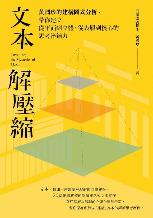 國珍老師新書《文本解壓縮》,借用電腦檔案解壓縮的概念,還原檔案內部層層疊疊的資訊處理方式,透過各類文本的示範:散文、會考的圖表分析寫作、文言文,科普文甚或是一篇已有論點立場的長文,都能藉由點、線、面、體重新分類提取,發掘自己未曾意識的概念化,完成「文本金字塔」的建造工程。