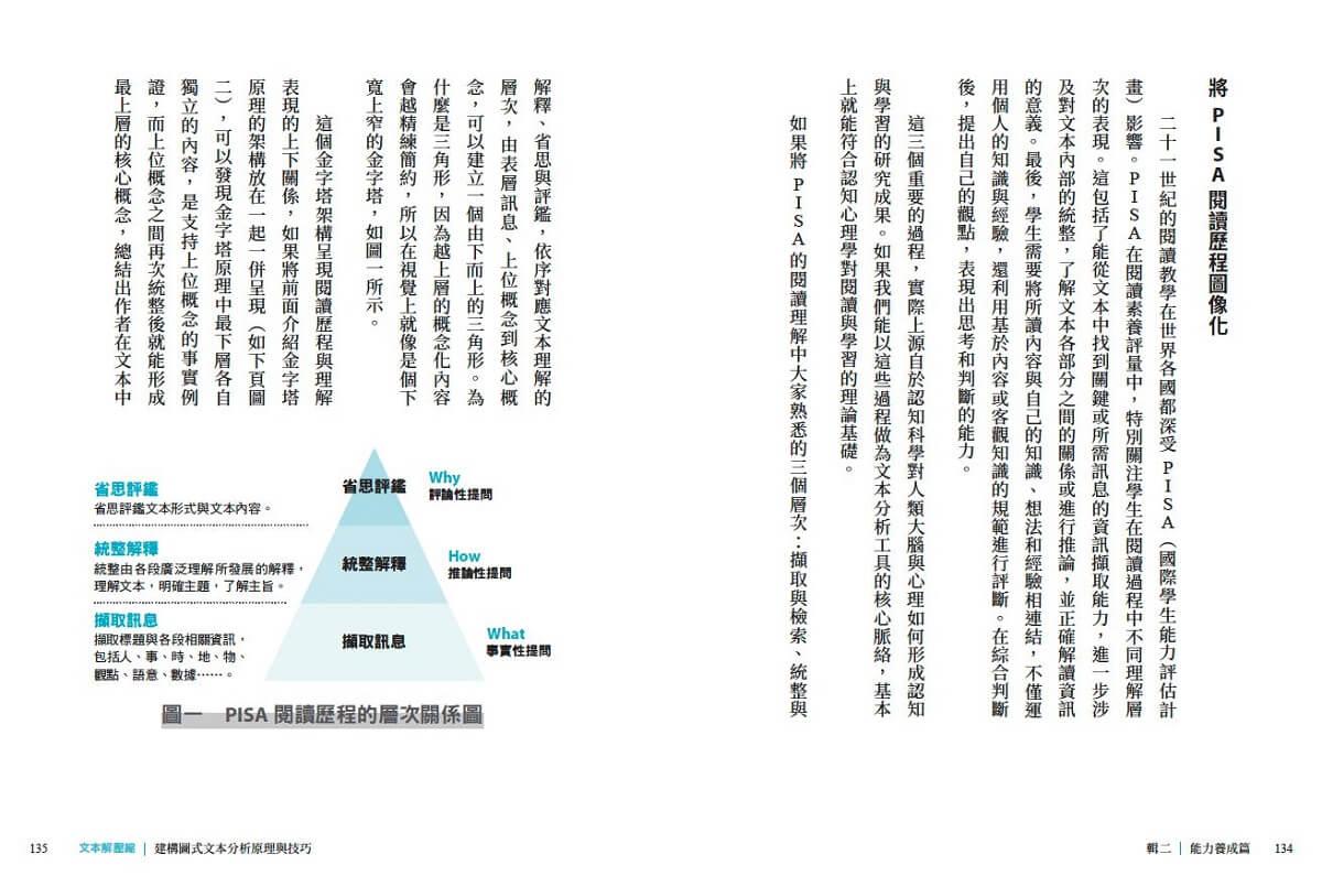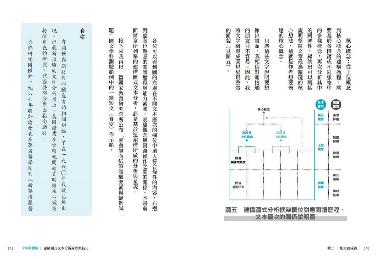 結合「文本層次」與「閱讀歷程」,融入閱讀心理學、認知基模、語意空間、金字塔原理、MECE原則等重要內涵,層層向上推導,將「上位概念」萃取而出,進而掌握「核心概念」的思考架構,透過「建構圖式文本分析」工具,讓文本解壓縮,帶你領略平面文本中的立體風景。