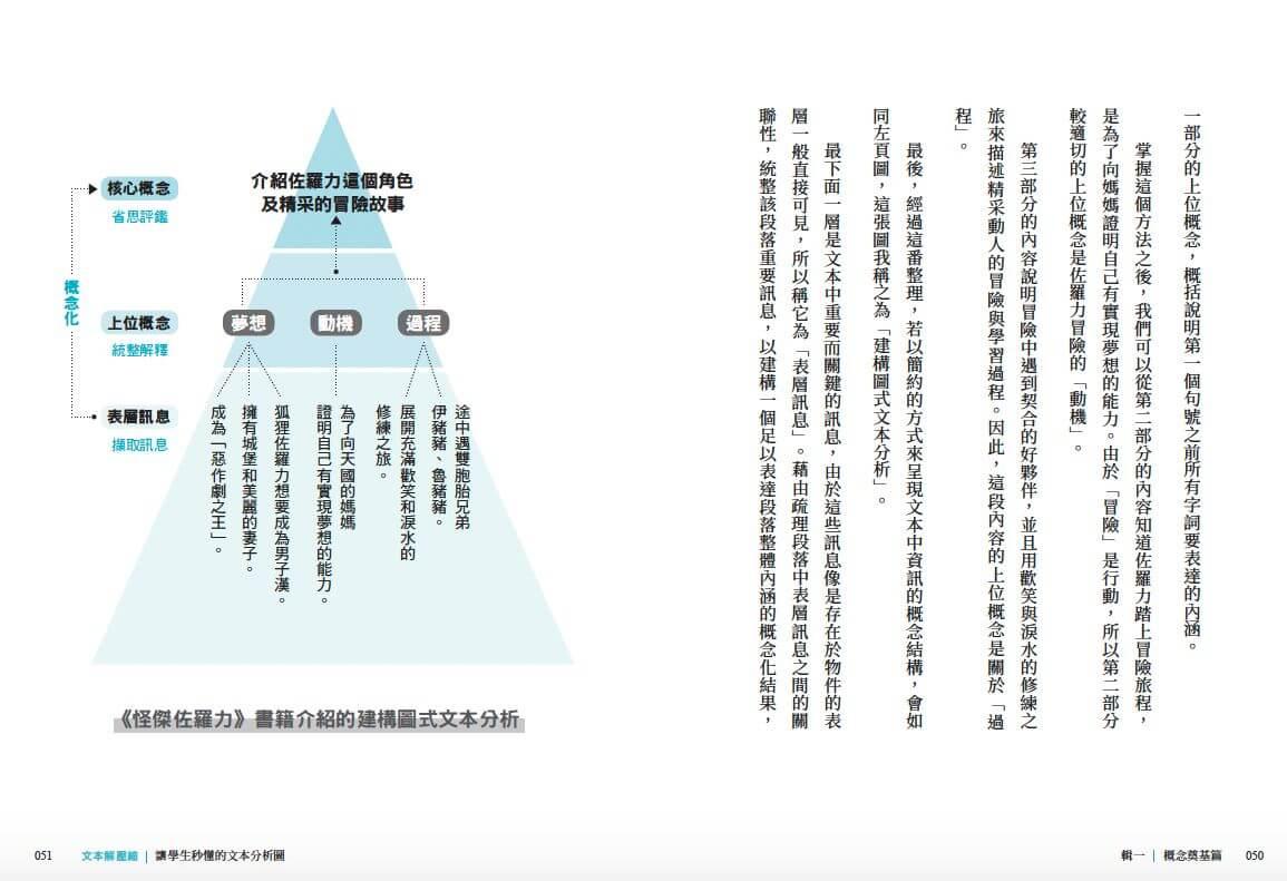 透過「建構圖式文本分析」,帶我們看見如同立體金字塔結構般的概念層次,從表層訊息、上位概念到核心概念,