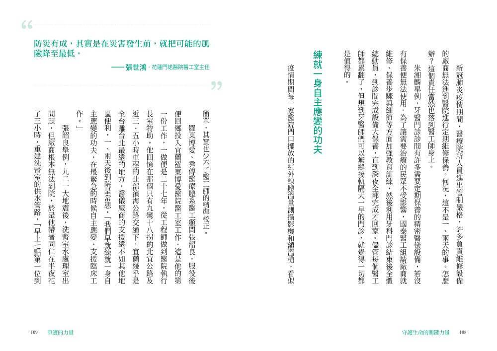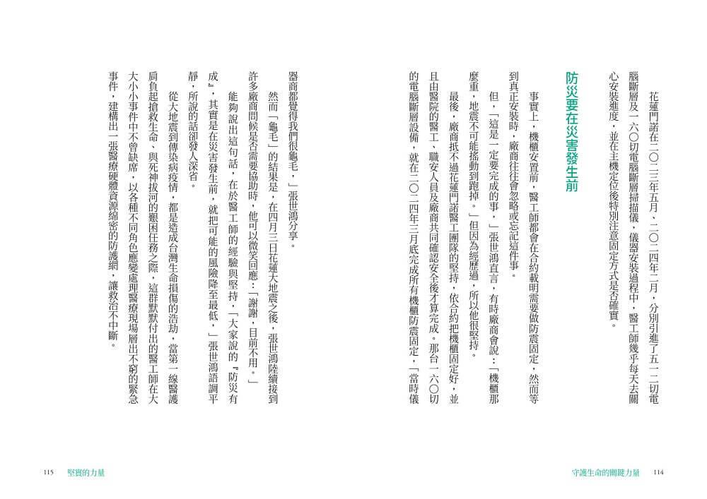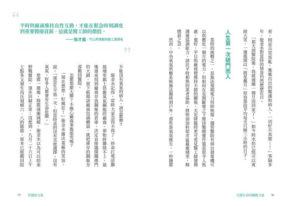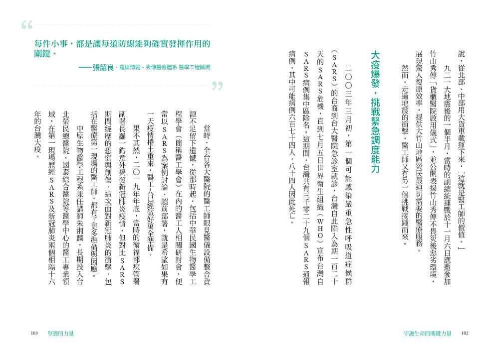 本書記錄下這些充滿熱情與使命感的醫工人,從維修現場到醫療現場,從醫院到跨領域創新的精采故事,希望能讓更多人看見他們沉默身影背後的拚搏、汗水與喜悅。或許他們只是小小的螺絲釘,卻是醫療產業中不可或缺的一環,更是守護你我健康的堅實力量。
