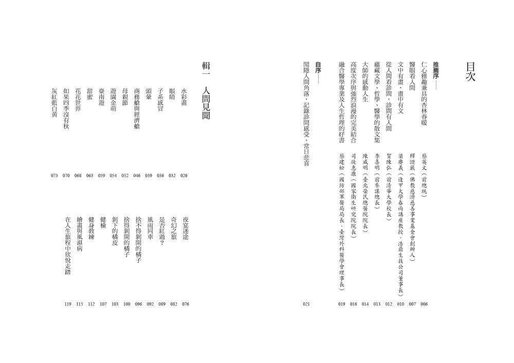 本書中的每篇散文,我們能看到一位醫者的仁心,讓人不僅僅是閱讀,更是在體驗和思索對生命應有的尊重與敬畏。──蔡建松 國防部軍醫局局長、臺灣外科醫學會理事長