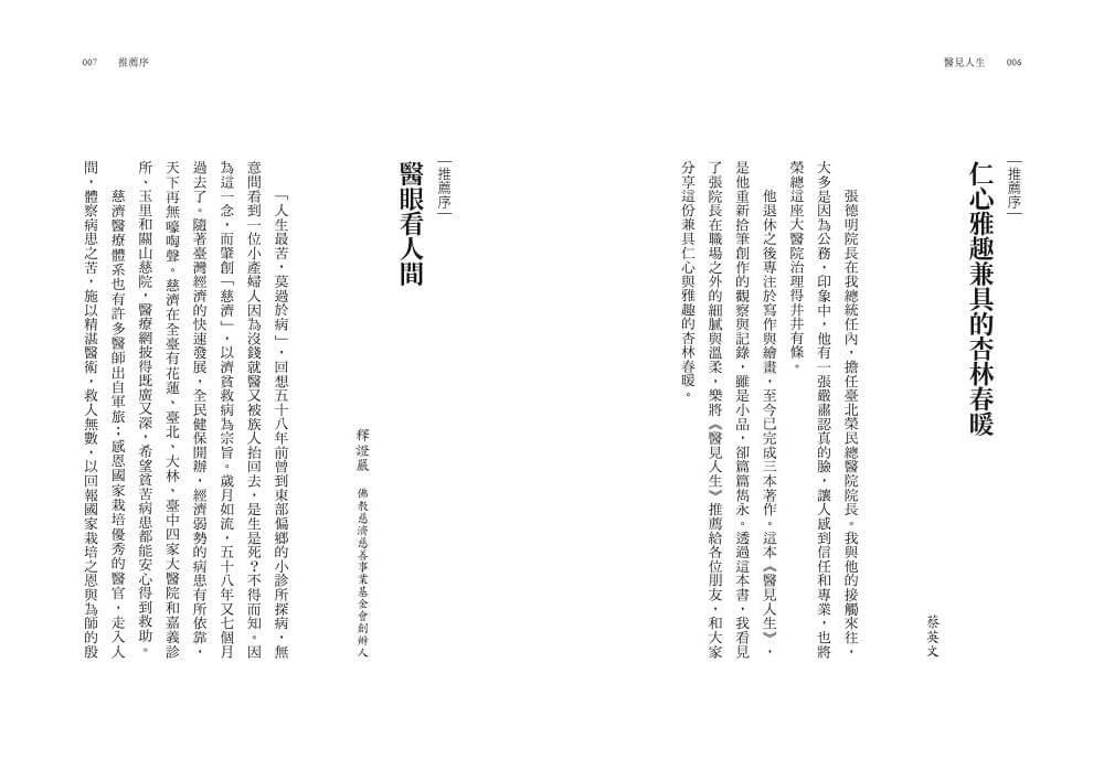透過這本書,我看見了張院長在職場之外的細膩與溫柔,樂將《醫見人生》推薦給各位朋友,和大家分享這份兼具仁心與雅趣的杏林春暖。──蔡英文 前總統