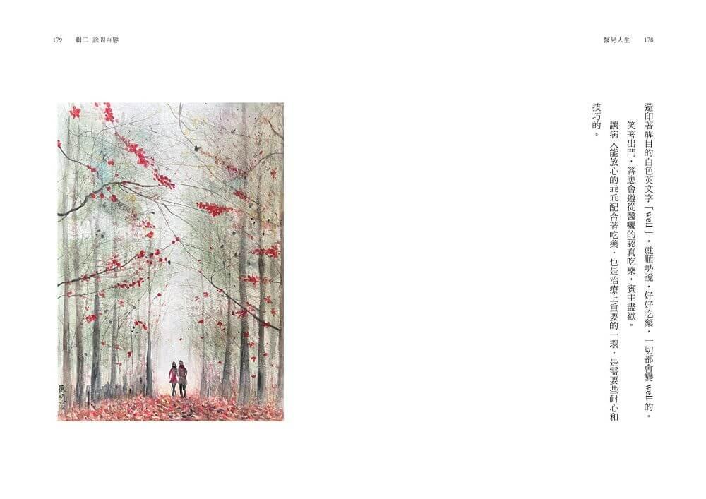 張院長這本書最大的特色就是文中有畫,畫中有文,二者缺一不可。從每一篇文章,每一幅圖畫中,我們彷彿都看到了生命中一些正向的東西,有希望,有幽默,有勇氣。張院長深厚的人文素養,將他的人間觀察,診間所見,先化為一篇篇細膩深邃的文字,讓讀者得以從中細細品味人生。緊接著一幅幅相關的圖畫,與先前的文字相呼應,每每引發讀者會心的共鳴。