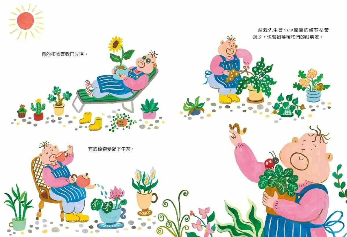 這是帶來好心情的小清新繪本!當生活充滿繁雜的事物、爆炸的資訊,或許這個故事能帶來一些舒服和放鬆。看著盆栽先生照顧一盆盆植物,像是照顧一個個孩子,給予個別的需求、搭配合適的衣裳、花上足夠的時間陪伴,