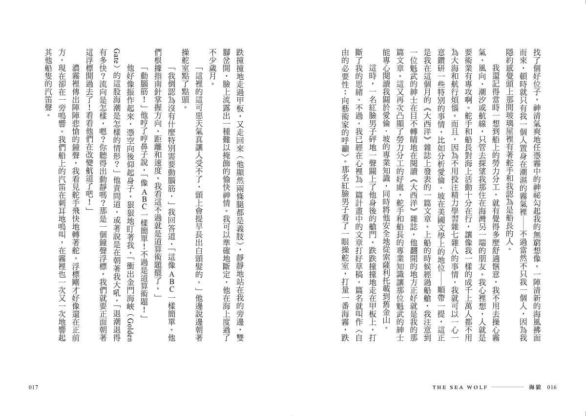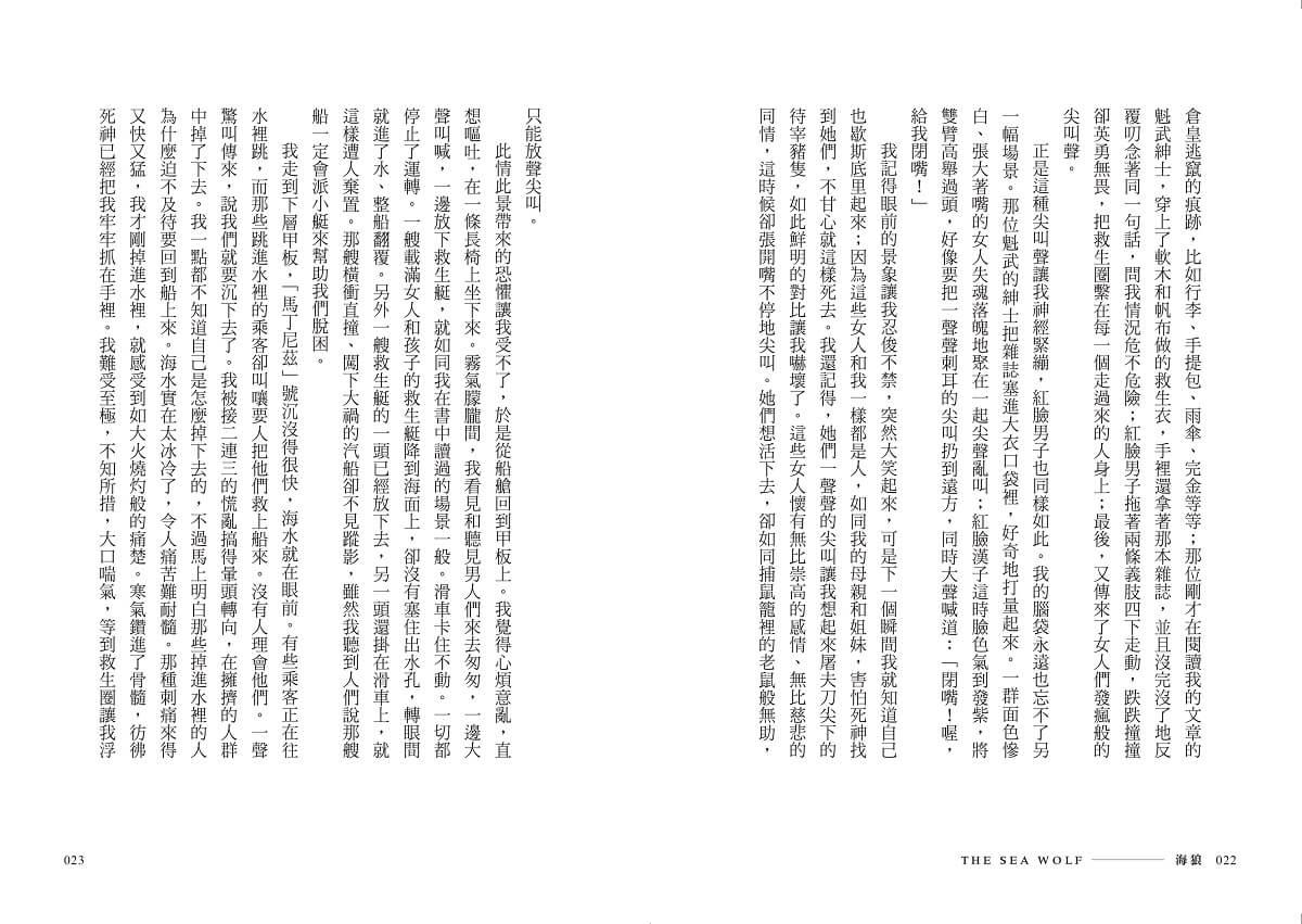 順帶一提,李區的手臂癒合得很順利,只是疤痕會跟著他一輩子。湯瑪斯.穆格里奇活在對他的極度恐懼中,在天黑之後都不敢貿然走到甲板上。前水手艙出現了兩三起爭執。路易斯告訴我,水手們的閒話傳到了船尾,有兩個打小報告的人被他們的同伴狠狠教訓了一頓。路易斯搖搖頭,對同坐一艘小艇的划槳手約翰遜的前景表示擔憂。約翰遜錯在他太過暢所欲言,就因為名字的發言,和狼.拉森發生過兩三次衝突。某天晚上,他在船中央的甲板上揍了喬韓森,自此以後,大副就都用正確的名字去叫他。但想當然耳,約翰遜是絕對不會去揍狼.拉森一頓。