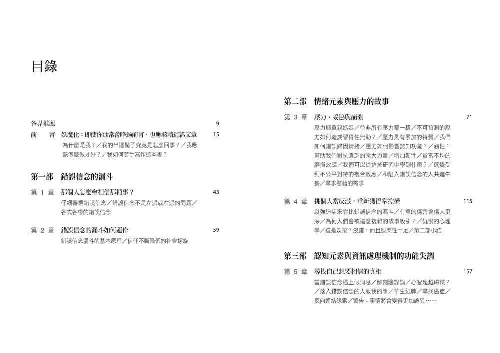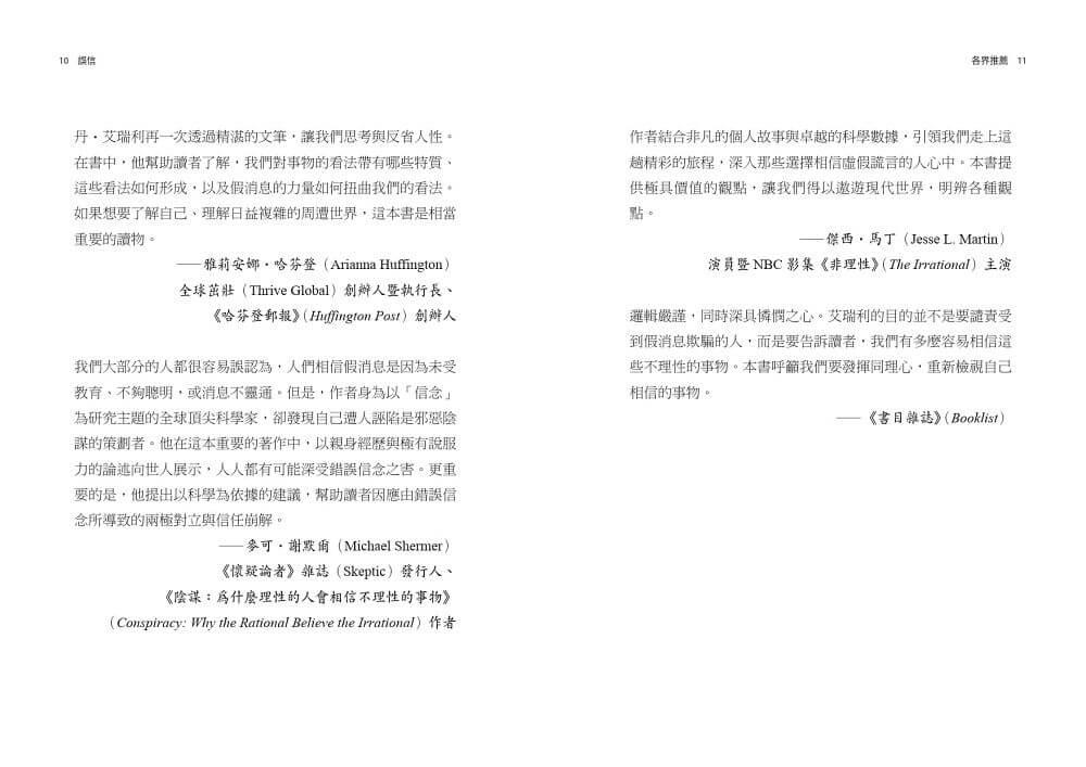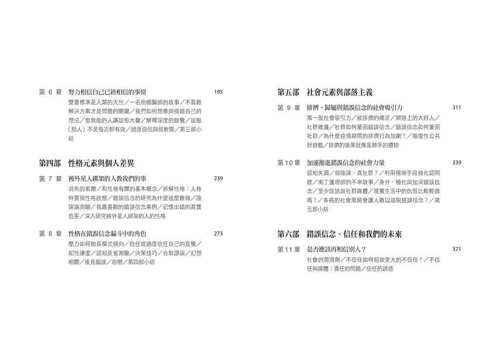 社會科學能提供一套極具價值的工具,讓我們了解這個過程的各種元素,進而得以解釋這些現象,並減輕它們的危害。我在書中收錄的許多研究都不是最新的報告。在我釐清導致人們產生錯誤信念的情緒、認知、性格與社會因素的探索過程中,我發現自己總會回頭查看相關領域的核心基礎。我並不意外會出現這種狀況。畢竟,容易產生錯誤信念的傾向,也是人性的一部分。