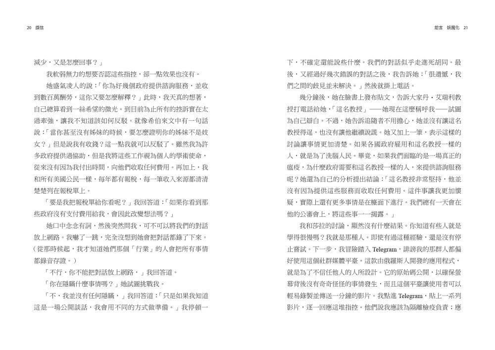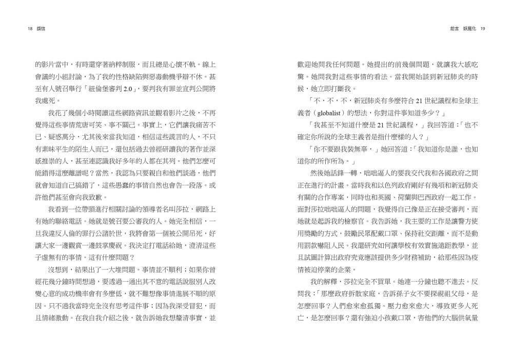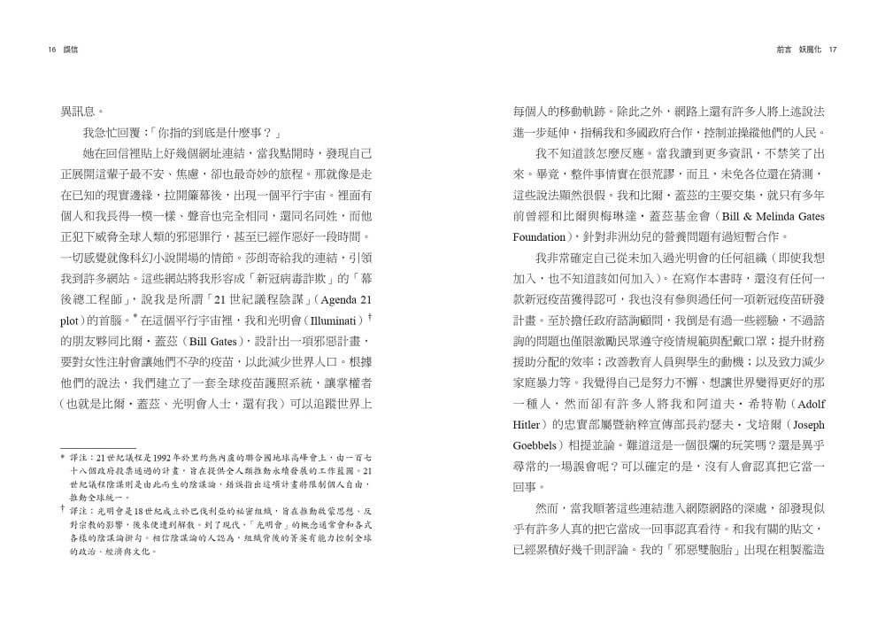 這本書的旅程是從我的自身經驗開始,但是很快就轉為探討影響到我們所有人的現象。它讓我得以探索我不熟悉的研究領域,例如性格、臨床心理學與人類學。陰謀論的散播與假消息的禍害,都是社會科學領域尚未企及的研究挑戰,也凌駕在我的專業領域之上,甚至超越任何一本書收錄的範圍。科技、政治學與經濟學在激發與加劇這些問題上,都扮演相當關鍵的角色。隨著ChatGPT與類似產品等高階AI工具問世,以及各項議題持續朝向兩極化發展,從社會與結構的觀點來看,這些問題似乎一時之間還無法解決。它吸引我的地方在於,了解為什麼人們這麼容易受到影響,而這也是我認為可以讓事情朝向正面發展的轉捩點。為什麼我們不只是相信假消息,還會主動搜尋與散布假消息?是什麼樣的過程,讓看似理性的人開始對不理性的信念有興趣,並且接納它,還進而為它辯護?善用同理心,而不是以批評或奚落訕笑的態度來處理這些問題,既能帶來啟發,卻也令人不安。