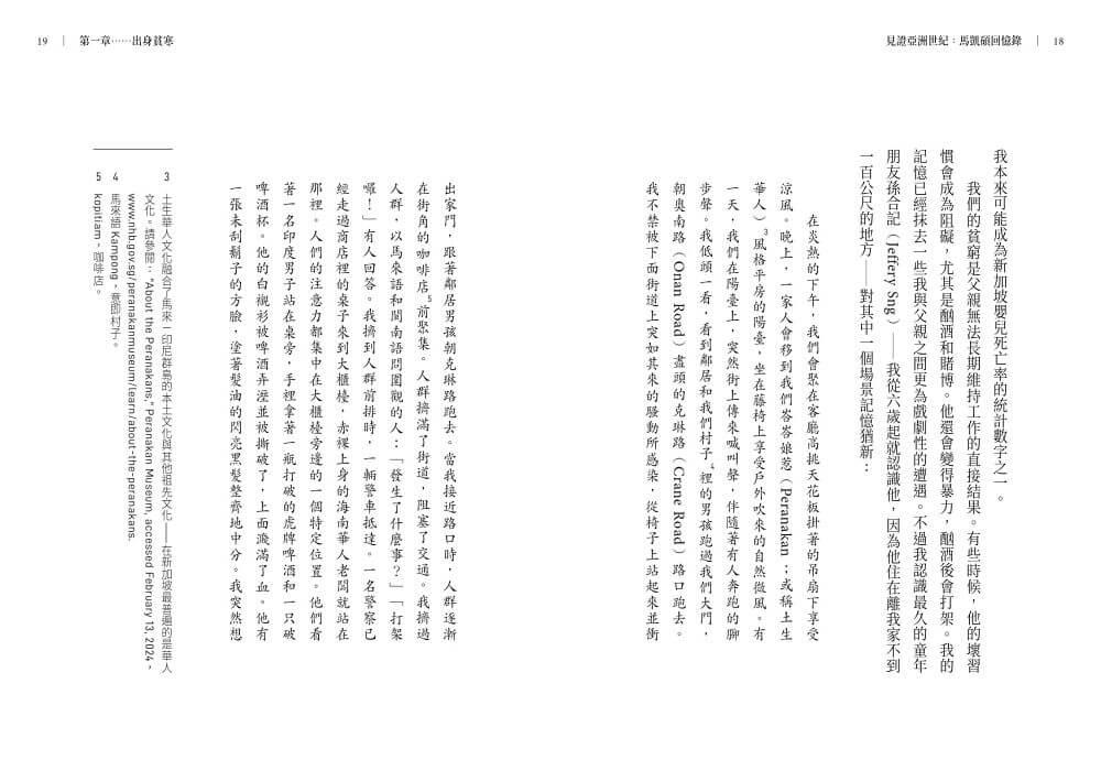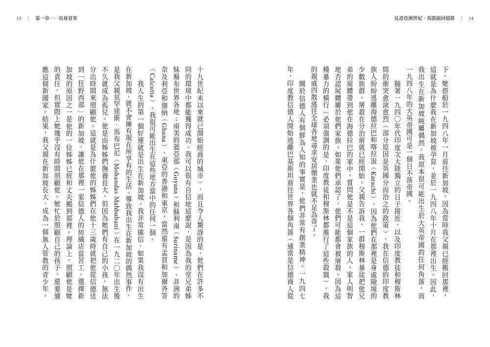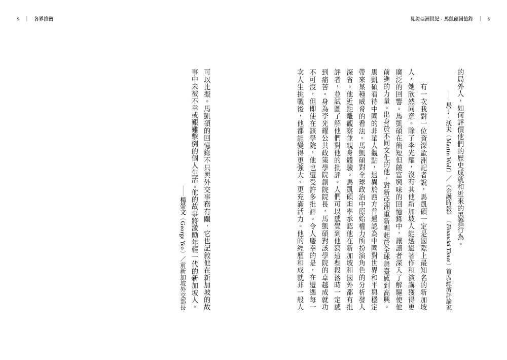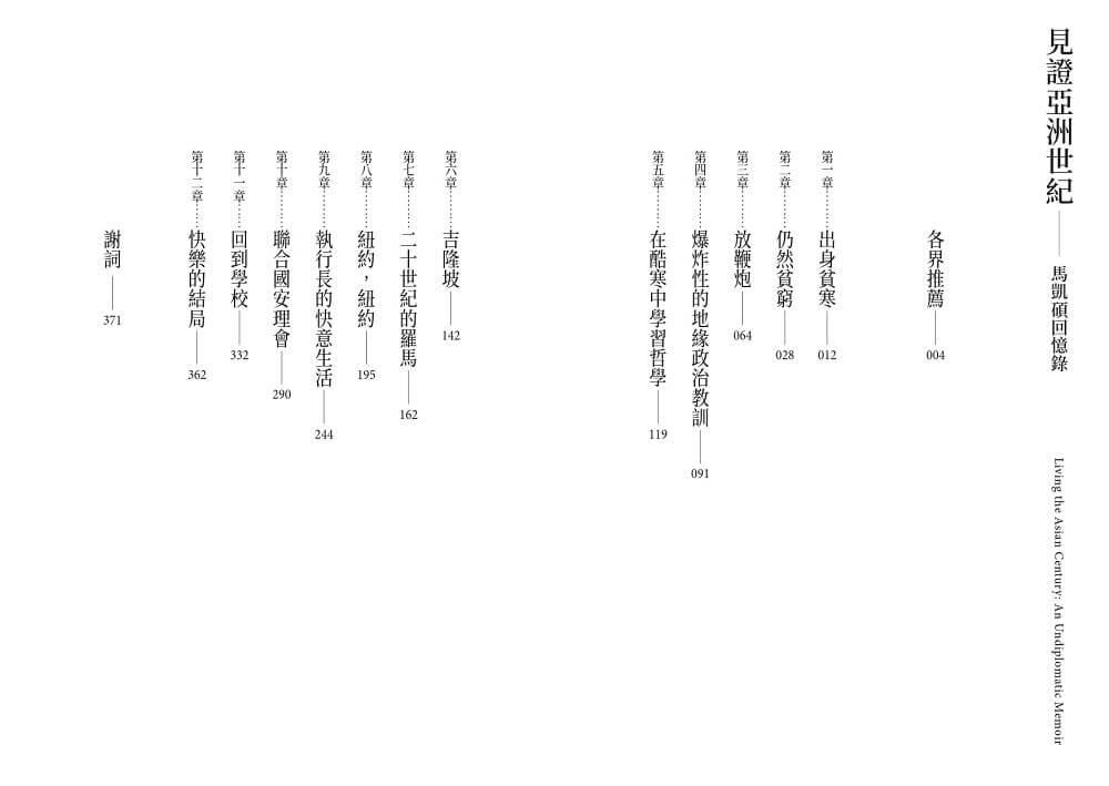 經歷「貧窮到富裕」,並生活在歷史上的多事之秋,將賦予任何人的生活豐富的複雜性。馬凱碩在亞洲世紀的歷程,從童年的貧困到成年的顯赫,反映出他勇敢、無畏無懼的精神。他以一個萬花筒般的視角,呈現了他在美國擔任外交官期間所經歷的世界政治激烈交鋒,以及他對新加坡本地的政治鬥爭及其開國元勛的近距離觀察,尤其是針對無與倫比的李光耀先生。這是一本令人著迷的回憶錄,以毫無保留的誠實把人們從各個全球危機帶入令人動容的個人生活與艱辛。閱讀它既是樂趣,也是教育。――梅拉.錢德(Meira Chand),新加坡文化獎得主和《不同的天空》(A Different Sky)作者