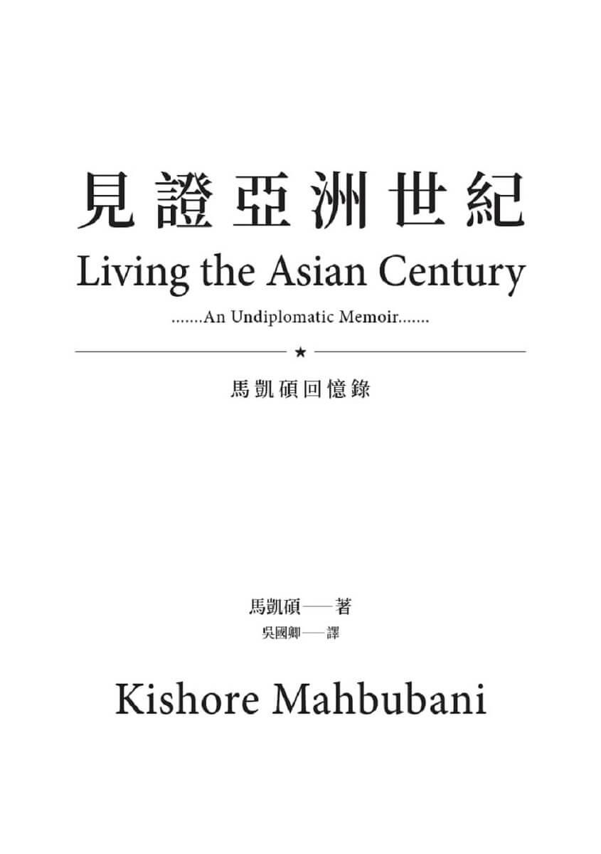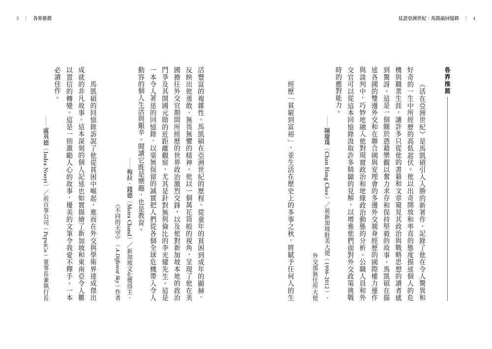 我在一九八一年第一次見到馬凱碩時,他是新加坡外交部的一名中級官員,留著大鬍子,相當好鬥,但無可否認地才華洋溢。此後,我有幸見證了他的崛起,成為傑出的新加坡駐聯合國大使、李光耀公共政策學院創院院長,以及一位具有睿智和洞見並在地緣政治思想界占有一席之地的公共知識份子。他的回憶錄引人入勝地帶我們窺見他從卑微的出身到國際外交最高殿堂的迷人旅程。本書穿插了他在世界各地形形色色的軼聞,並充滿馬凱碩溫暖而親切的個人風格,對所有熱中外交職涯和渴望從中學到人生教訓的人來說,這是一本必讀的書。――夏希.塔魯爾(Shashi Tharoor),作家、國會議員、前聯合國副祕書長、前印度政府部長