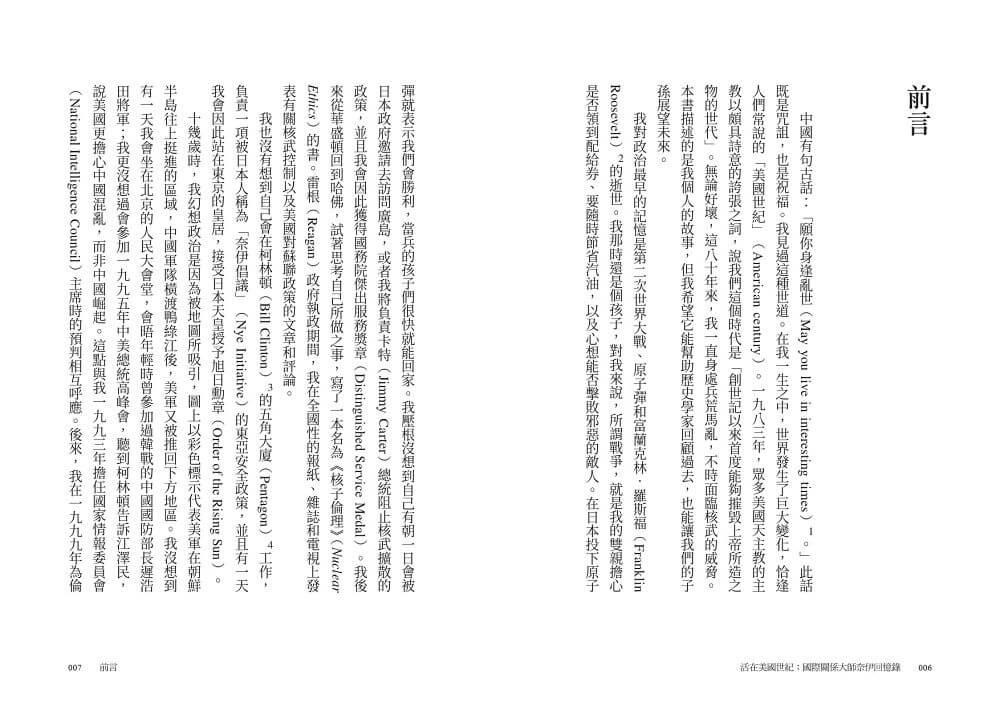約瑟夫.奈伊精彩的回憶錄記錄了他的才智、好奇心和令人眼花繚亂的職業生涯。希望他再寫十本充滿洞見和智慧的書籍!── 珍.哈曼(JANE HARMAN),前國會議員和國防戰略委員會主席